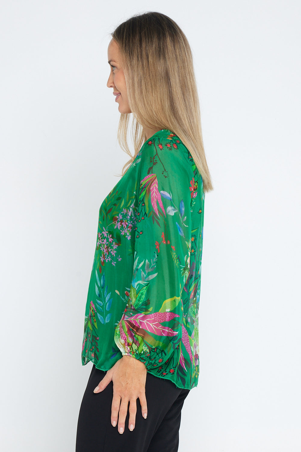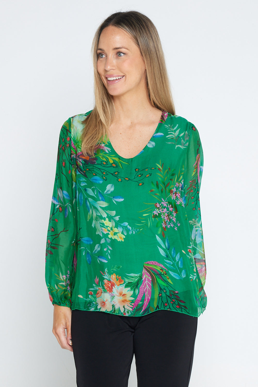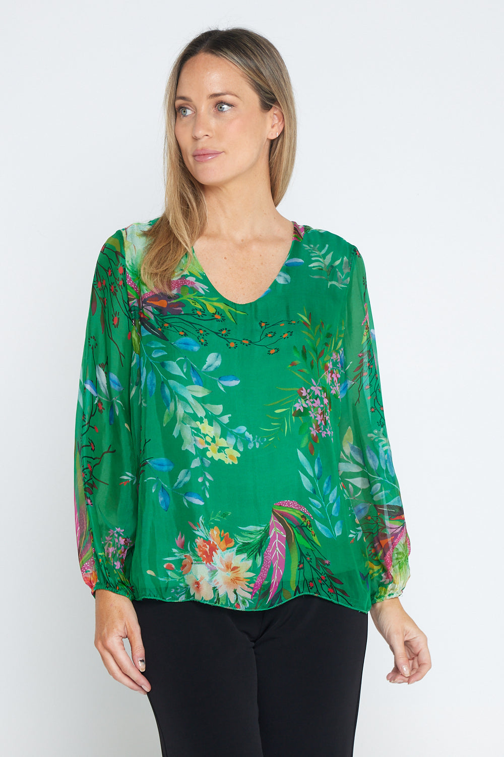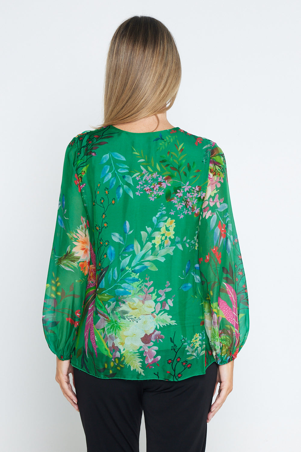 Sierra Long Sleeve Silk Top -  Emerald Botanical