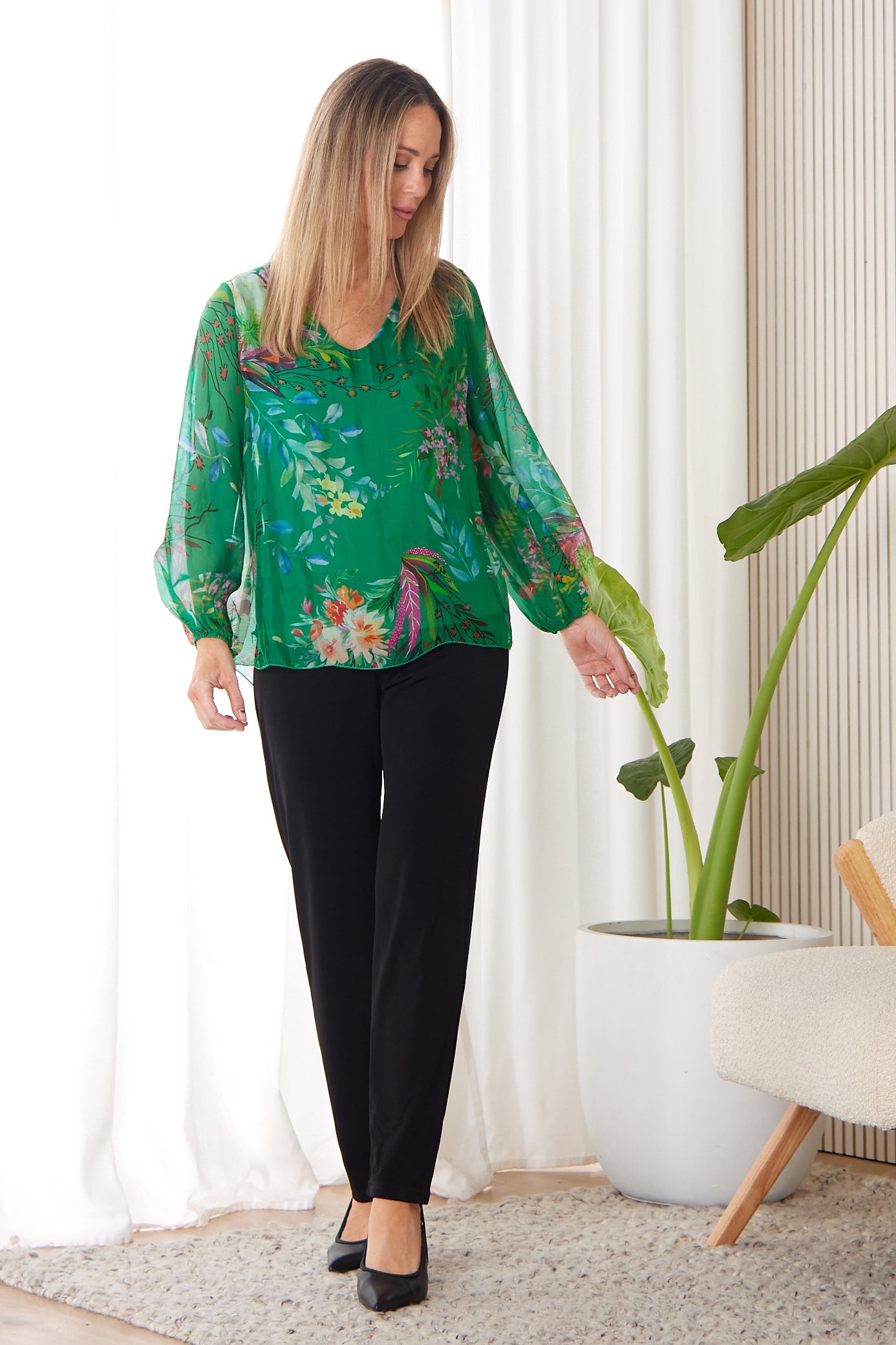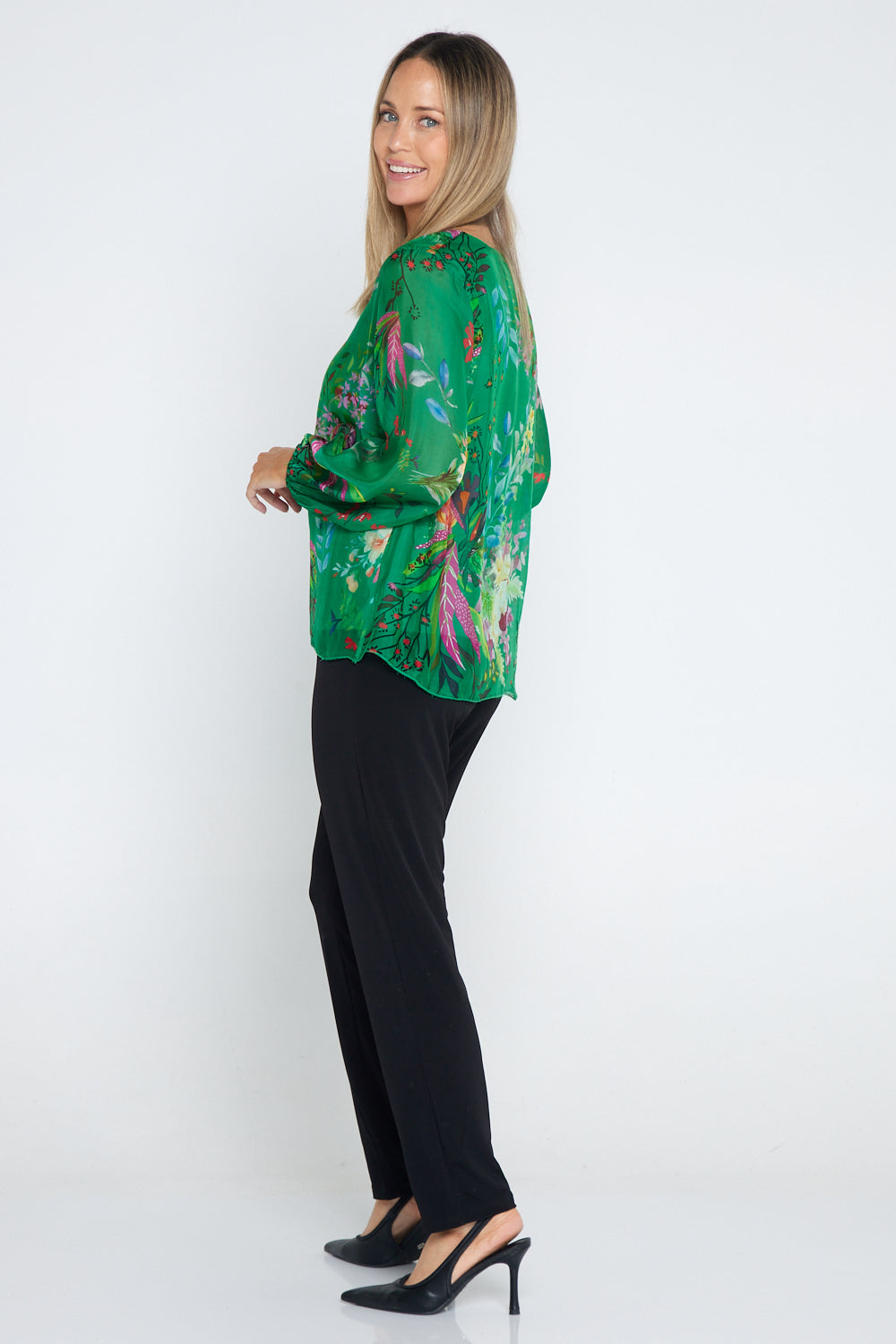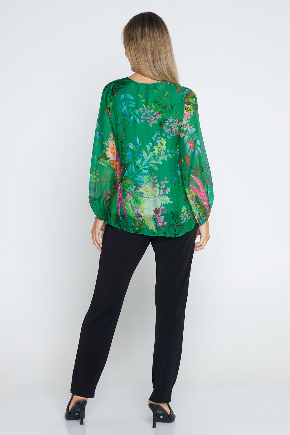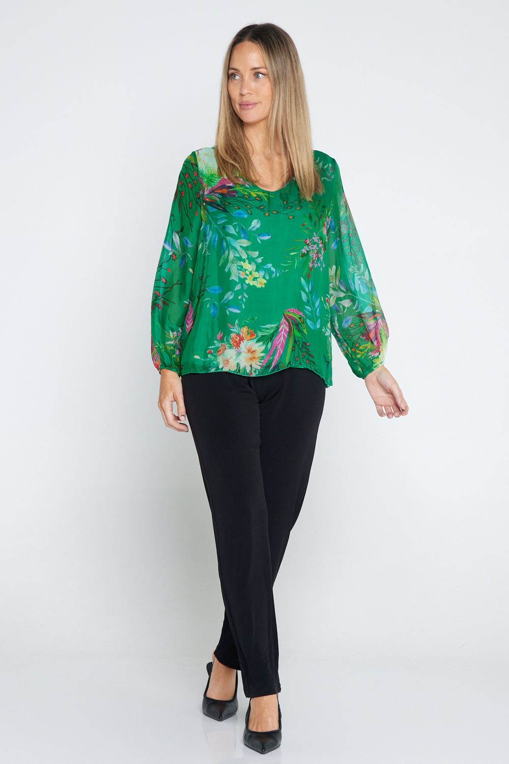 Sierra Long Sleeve Silk Top -  Emerald Botanical