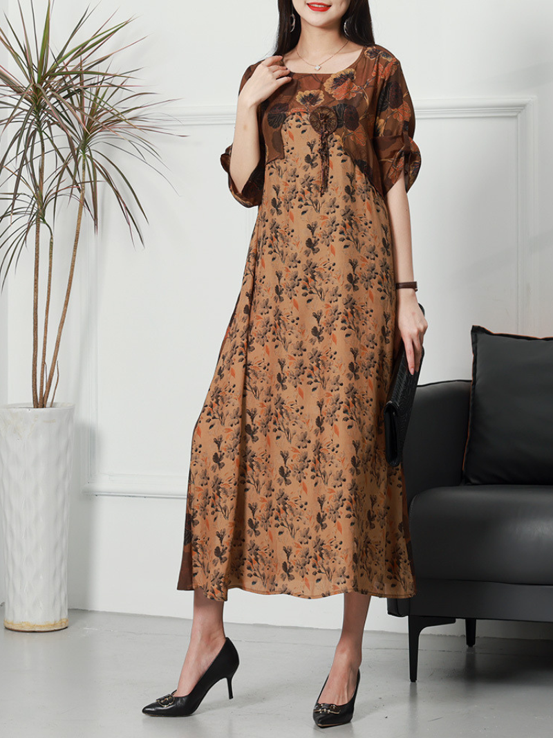 Casual Printed Flower Short Sleeved Loose Waist Midi Dress