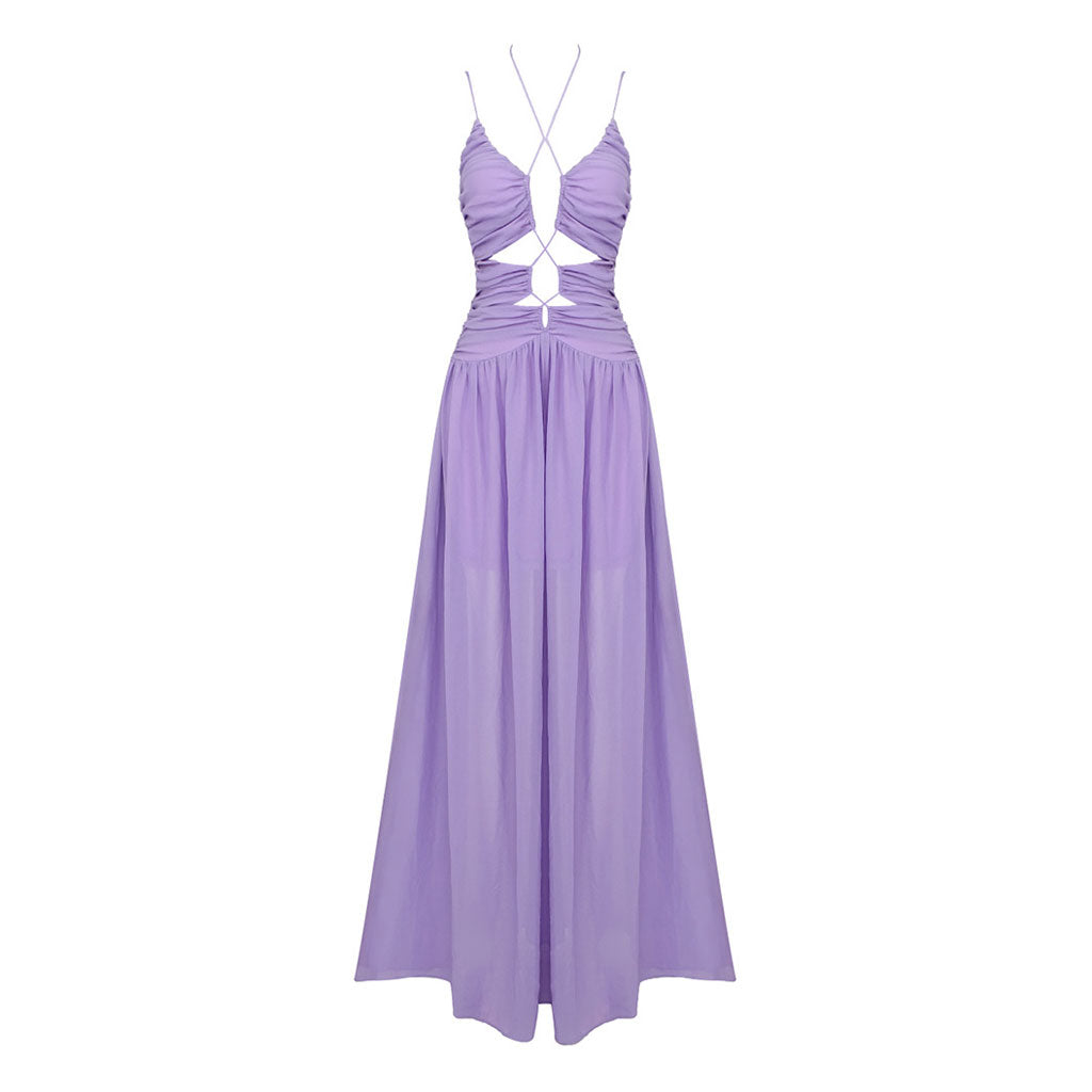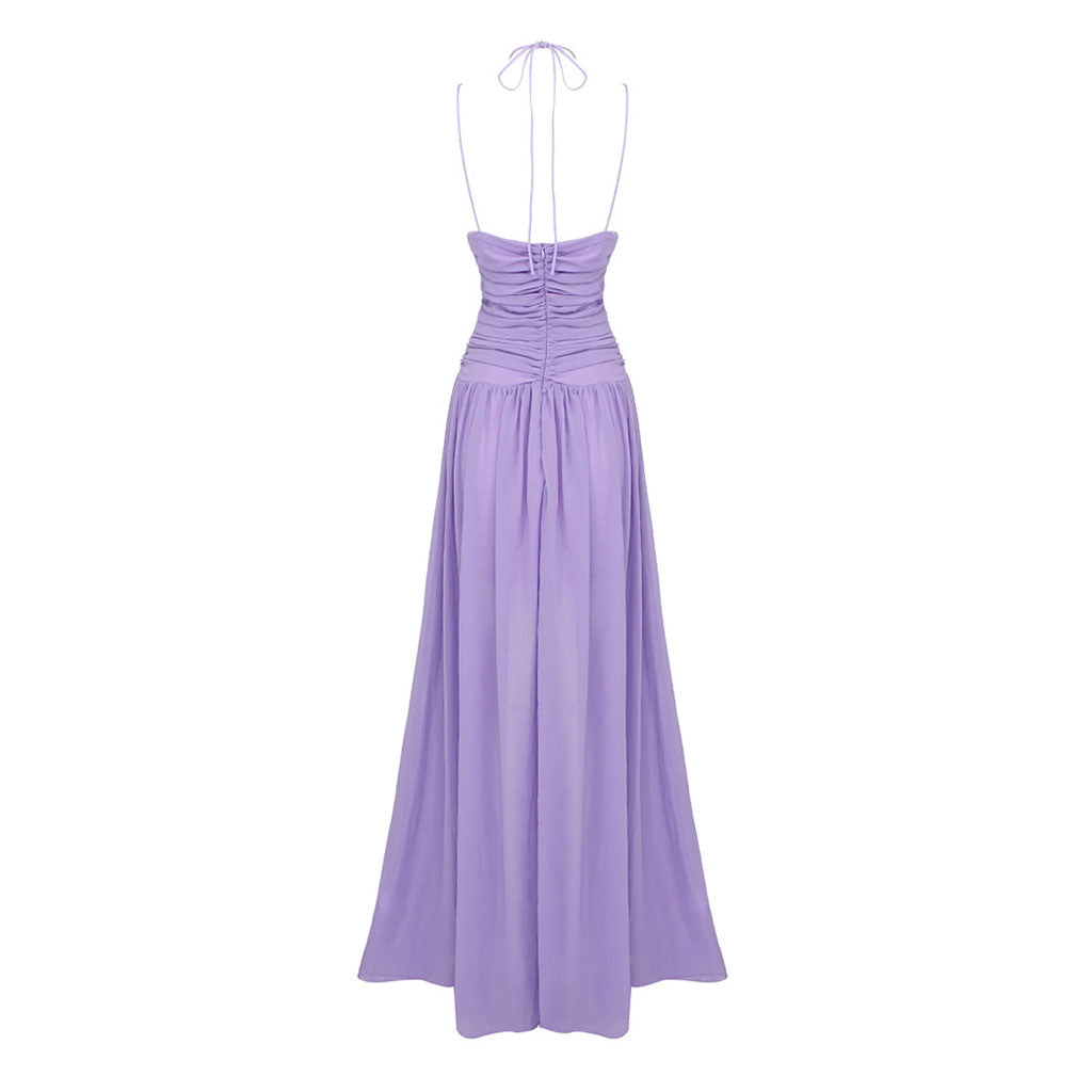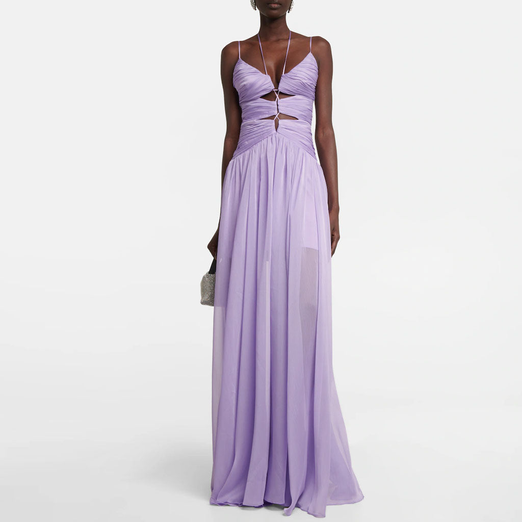 Ethereal Halter Cinched Neck CutOut Ruched Chiffon Sleeveless Maxi Evening Dress