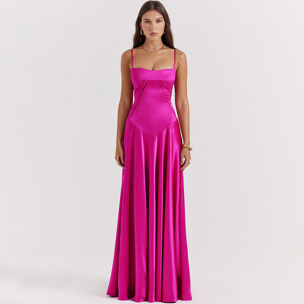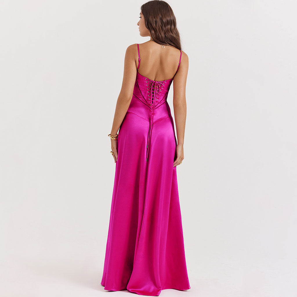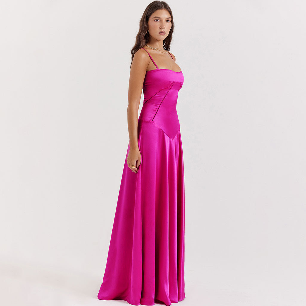 This statement designer dress. crafted from sumptuous rich color silky satin. exudes timeless opulence. The fluid drape creates a stunning sleeveless silhouette. complemented by a square neckline and delicate slim shoulder straps. while the lace-up back adds a touch of vintage 80s allure. Gracefully sitting below the natural waistline. the formal gown offers an elegant and sophisticated appeal. The cascading skirt skims over the hips. flowing freely to the floor. promising an enchanting look. This sexy slip maxi dress is perfect for romantic date nights. grand balls. weddings. and any opulent occasion. celebrating the epitome of glamour and elegance.