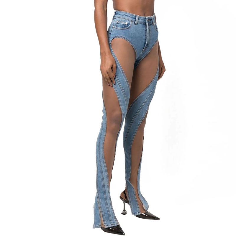 Sheer Mesh Panel Side Slit High Rise Skinny Spiral Jeans - Blue