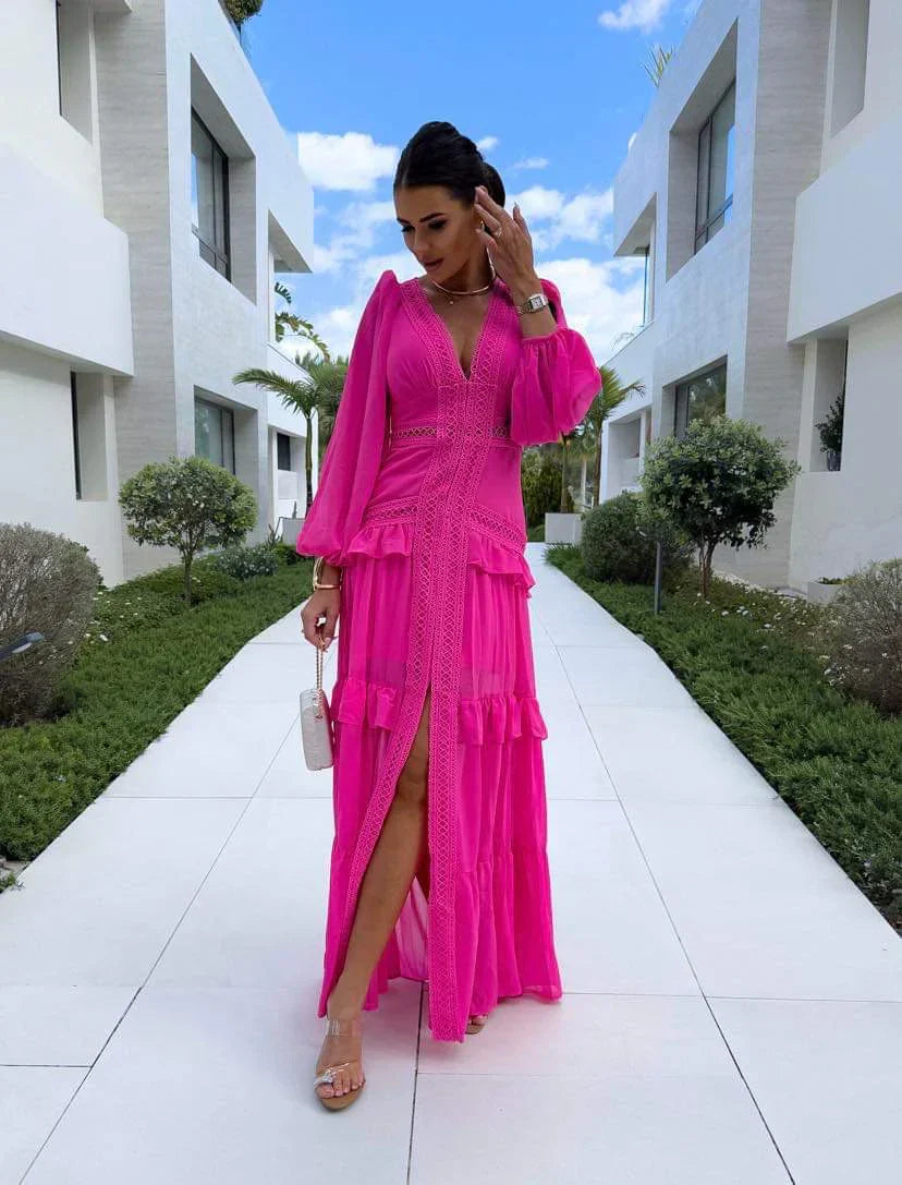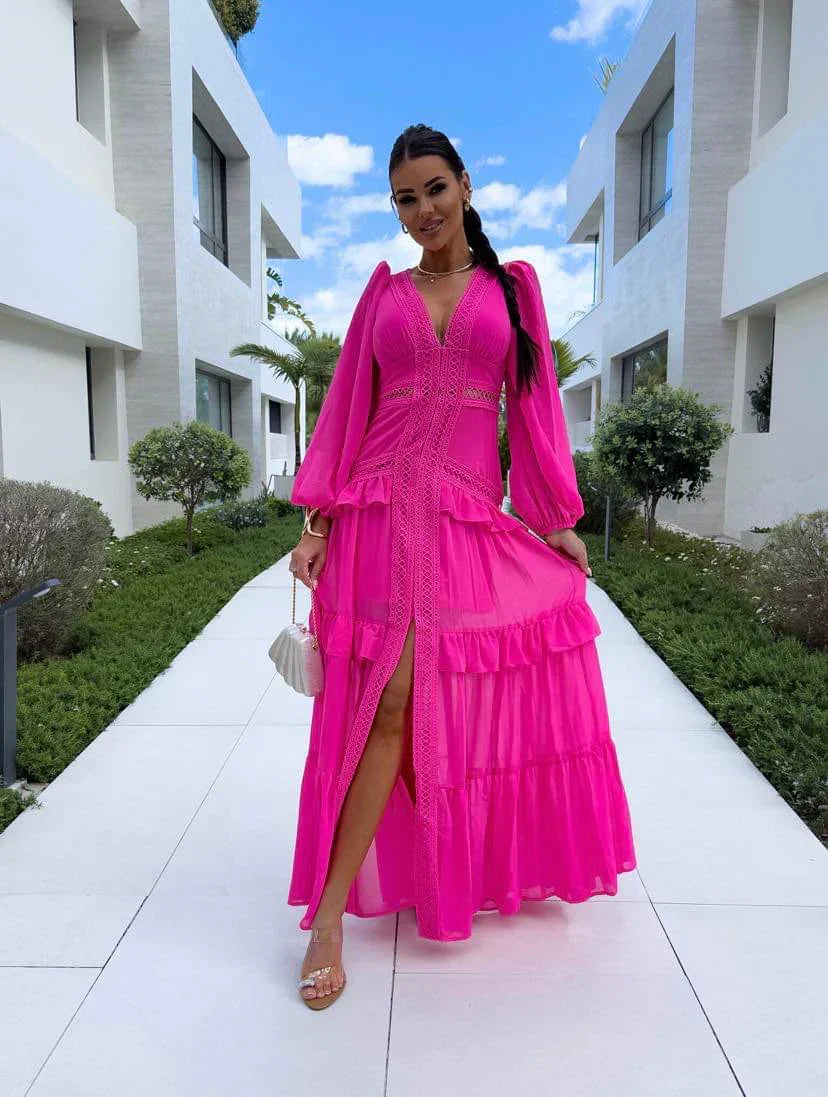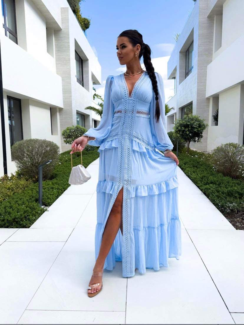 The Amal Tiered Long Sleeve Maxi Dress embodies effortless elegance and comfort, making it a standout choice for any occasion. With delicate lace details and flowing tiers, this dress offers a flattering silhouette that exudes charm and grace.