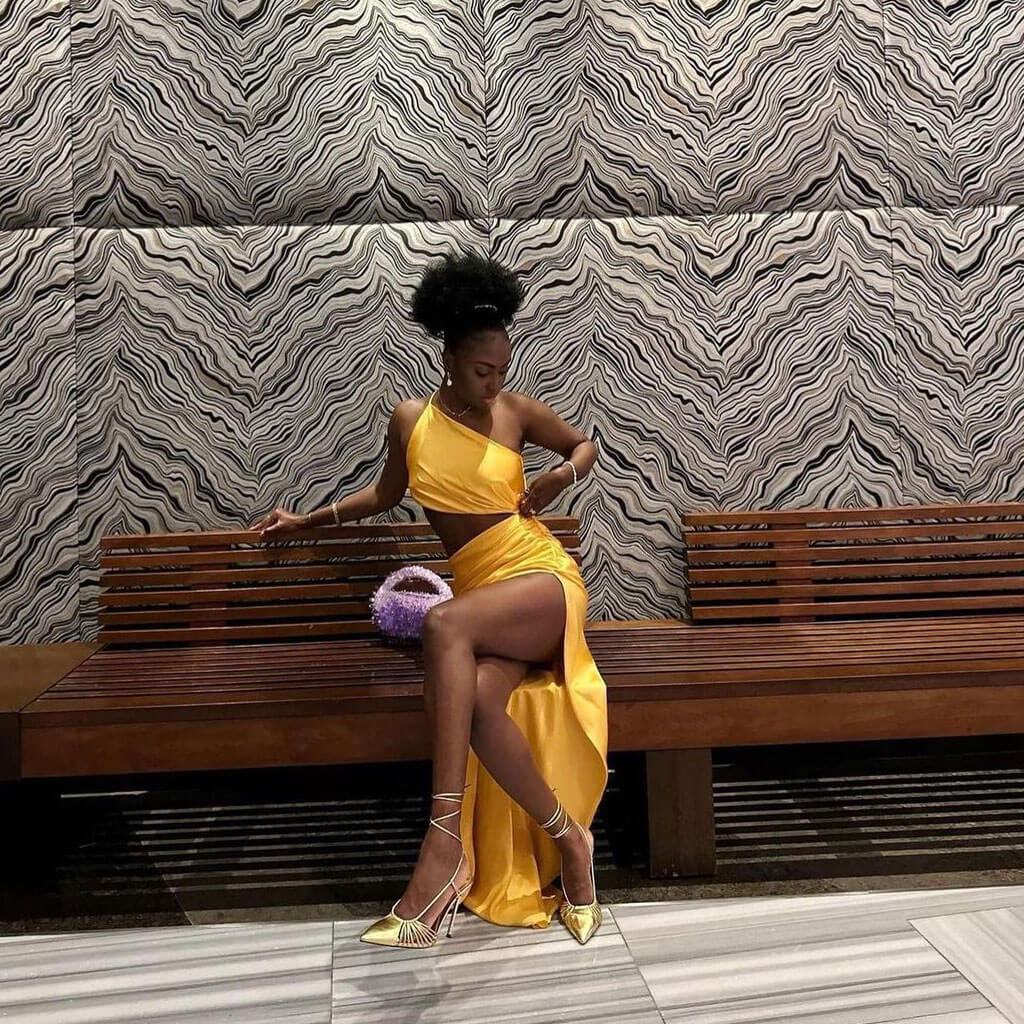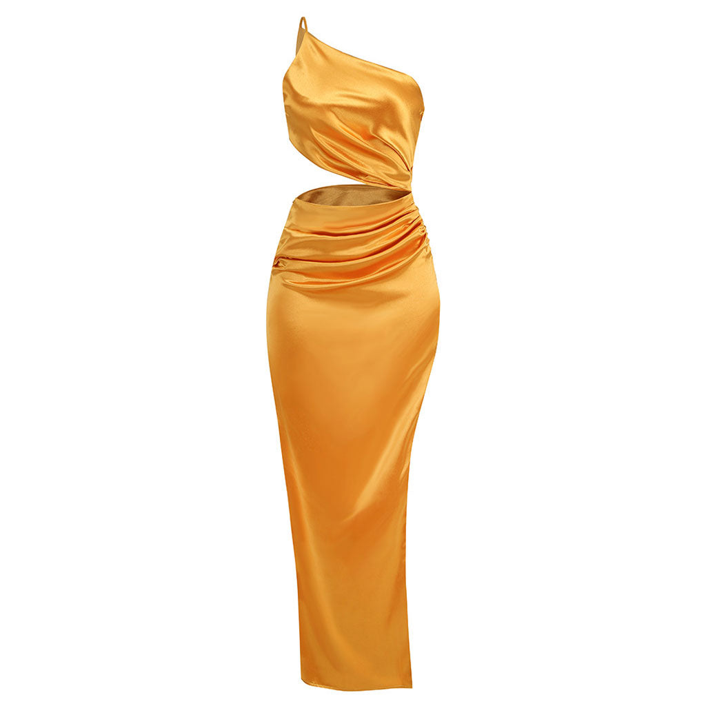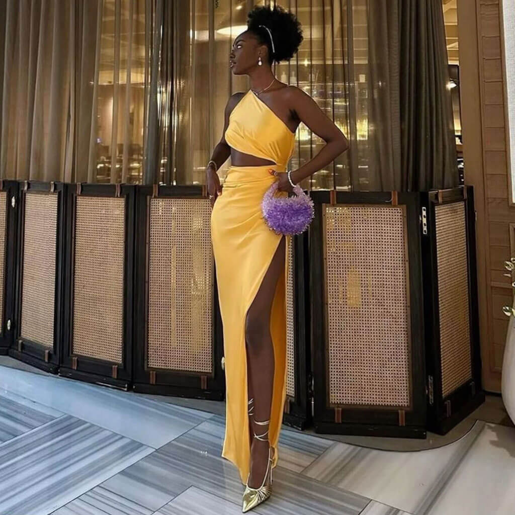 Elegant One Shoulder CutOut Split Thigh Ruched Satin Maxi Evening Dress