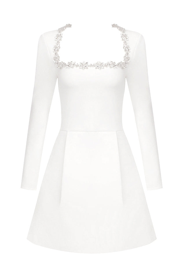KIMBERLY is a white mini dress, crafted from exclusively designed white crepe fabric with a jewel-embellished square neckline, shoulder pads, structured bodice, and two pleats adorning both the front and back of the skirt.