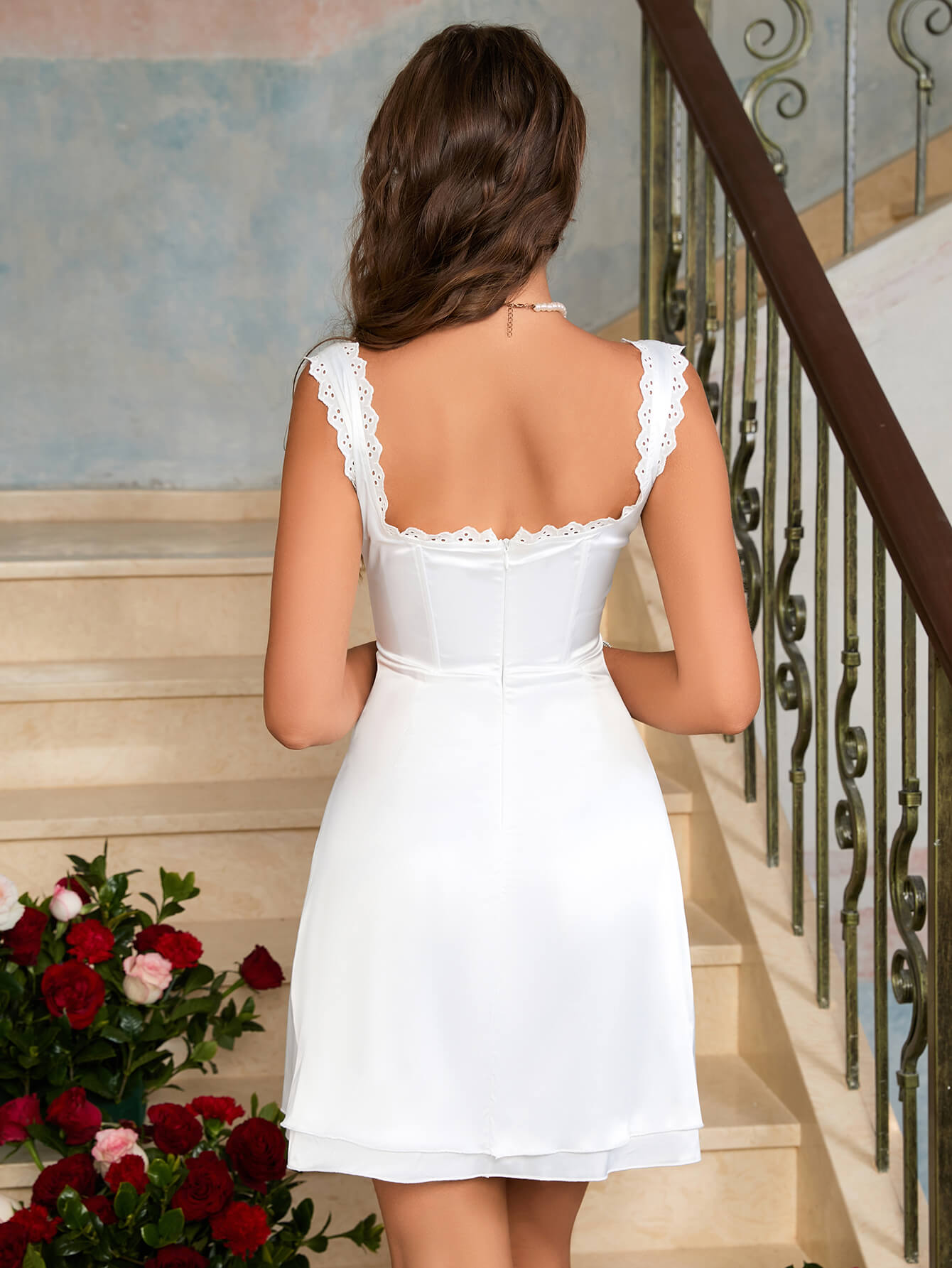 • Details: Backless, Zipper, Eyelet Embroidery