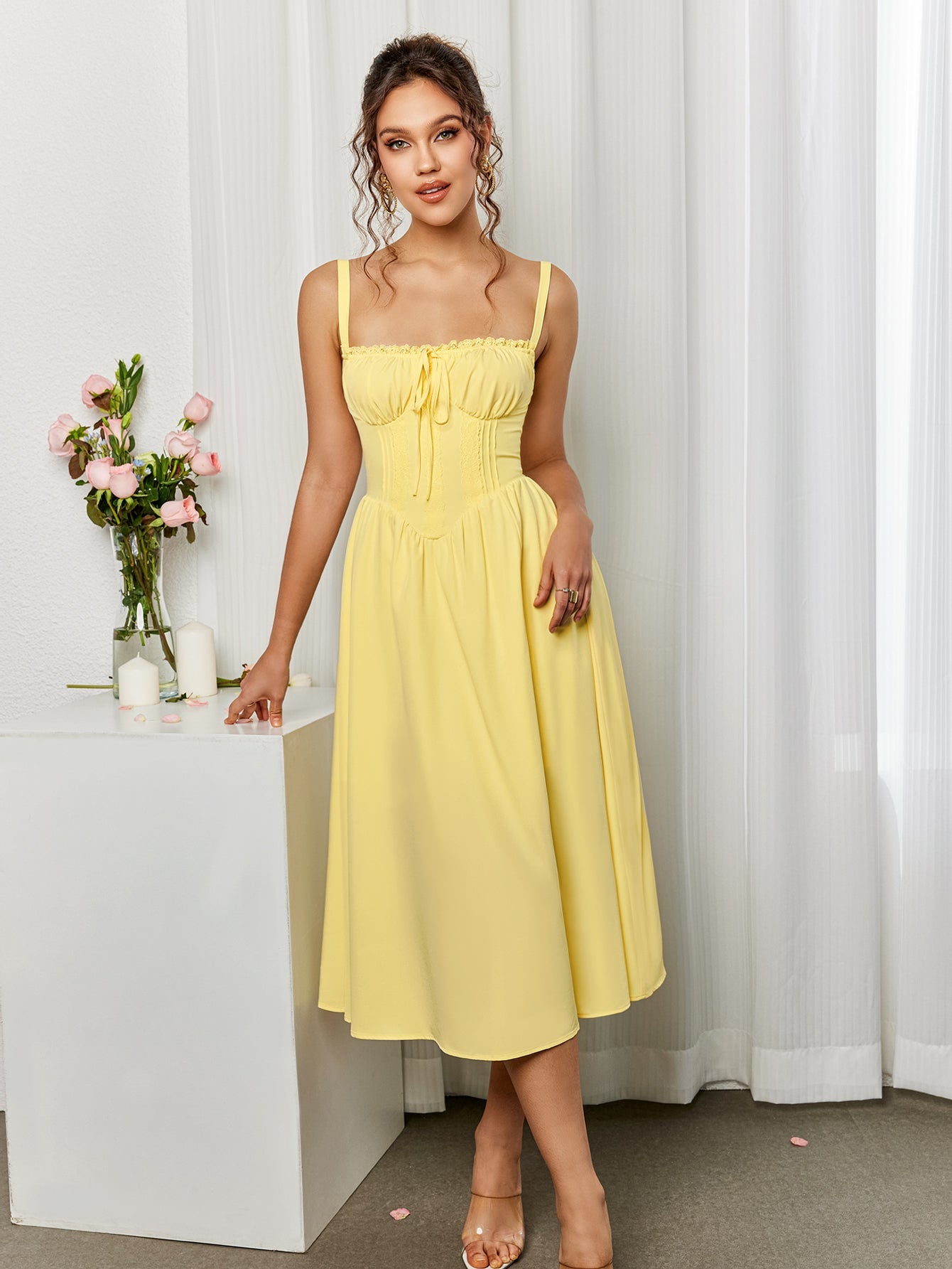 Lace Trim Tie Front Split Thigh Cami Dress
