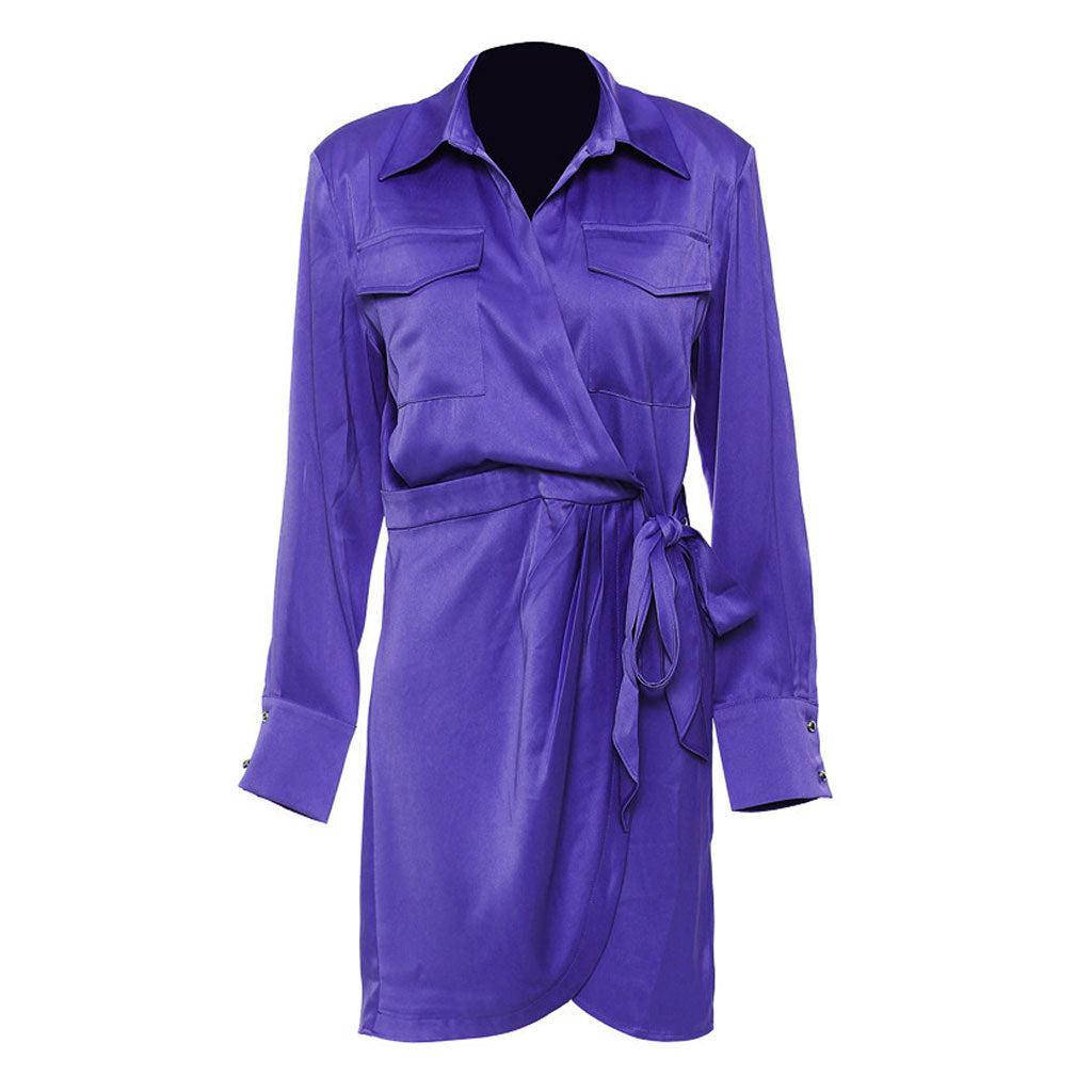 Luxury Collared Long Sleeve Patch Pocket Tie Waist Pleated Satin Midi Shirt Dress