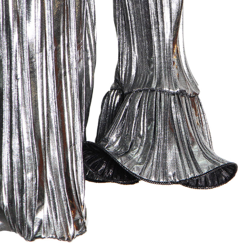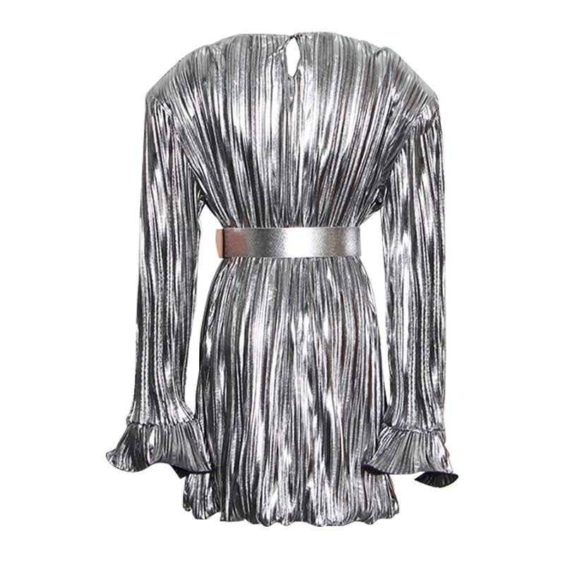 The designer label holds an incredible sense of romanticism and magic. This metallic silver dress evokes LUXE's high-octane glamour. Crafted from the lustrous silver-toned lamé. this mini style has a round neckline. long sleeves and fluted cuffs. The included belt emphasizes the waist and a slim fit. We love the shoulder pads that sport the shiny look with style and elegance. As for styling tips. make sure to balance the strong shoulder with more fitted pieces. Wear yours with pointed-toe silver boots for a playful upgrade to girl's night out.