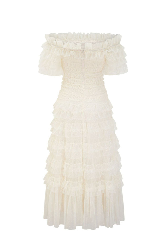 Look like a fairytale dream at your cocktail party with our vintage-style ruffled midi dress in Spring and Summer! This enchanting tulle dress, featuring fluttering short sleeves and an off-the-shoulder neckline, embraces that fabulous side. Cinched at the waist with a tie, crafted from dreamy dotted tulle fabric, and adorned with ruffled tiers, it's the bomb dot com for cocktails, garden parties, and fancy events. Available in classic black or charming apricot, this quiet luxury A-line tea dress is a must-have for women seeking that boutique outfit that screams 'fancy shmancy' dresses in style!