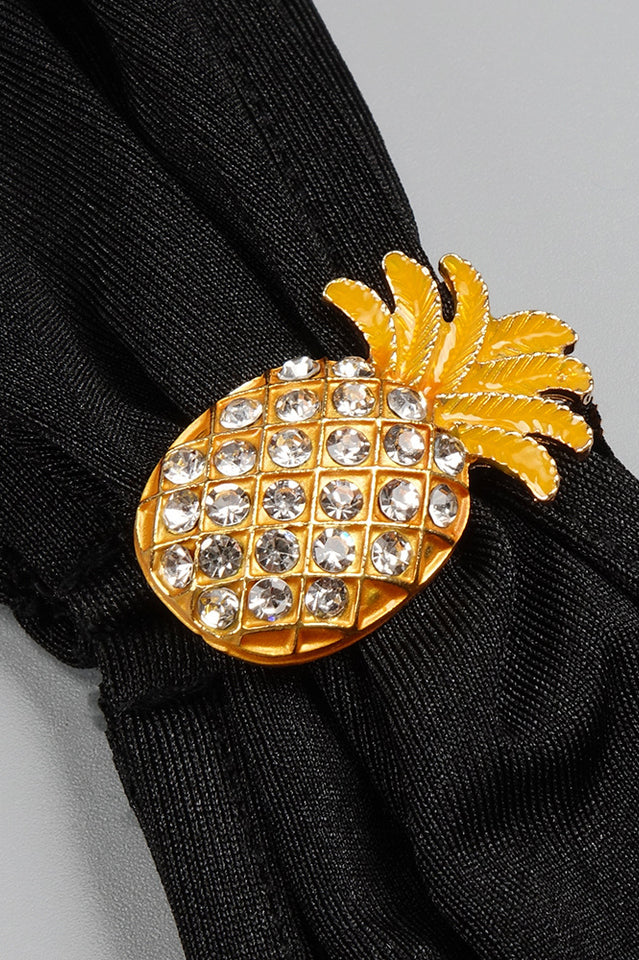 Cut-outs at front and back with gold-tone metal pineapple pendants