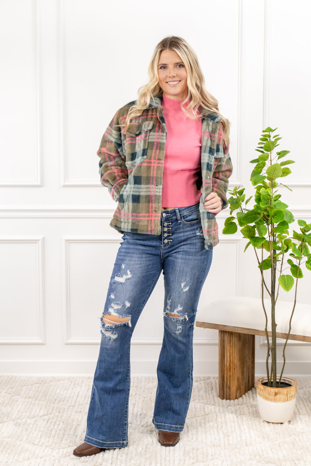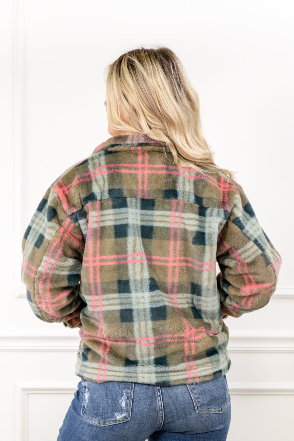 The Misty Mountain Plaid Jacket is designed for ultimate comfort and practicality. Stay warm with its fuzzy plaid fabric, perfect for chilly days. Move freely with its slightly relaxed fit and dropped shoulders. And keep your essentials close at hand with its convenient chest and side pockets. Plus, the classic button-down closure adds a touch of timeless style.