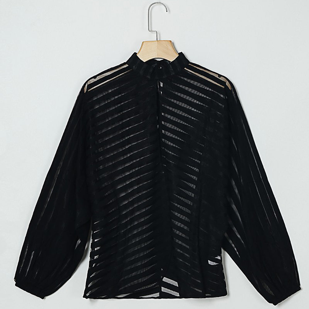 Casual Black Mesh Sheer See-through Long Sleeve Top Solid Blouse