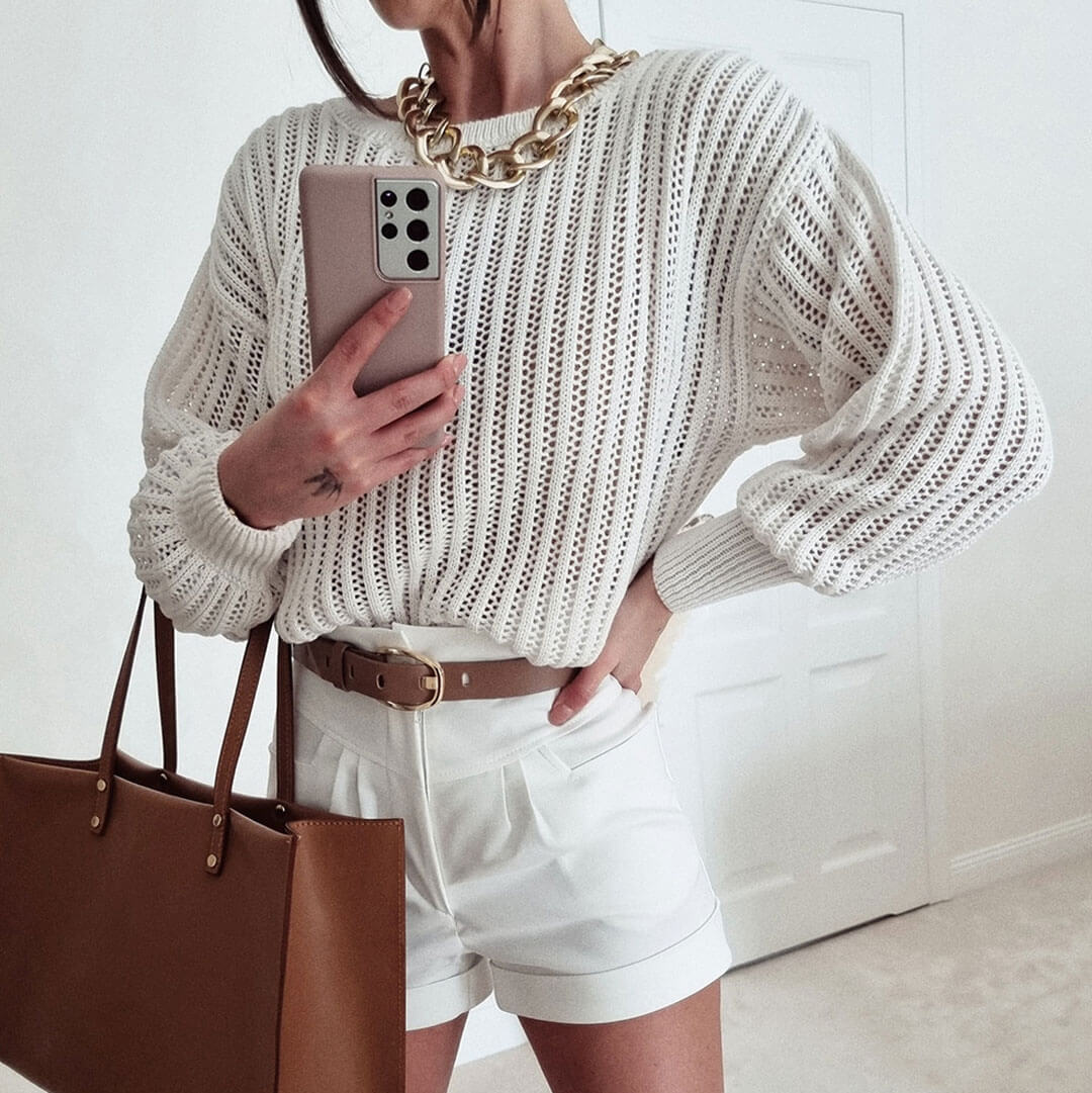 Pretty Crochet Knit Drop Shoulder Bishop Sleeve Crew Neck Sweater - White