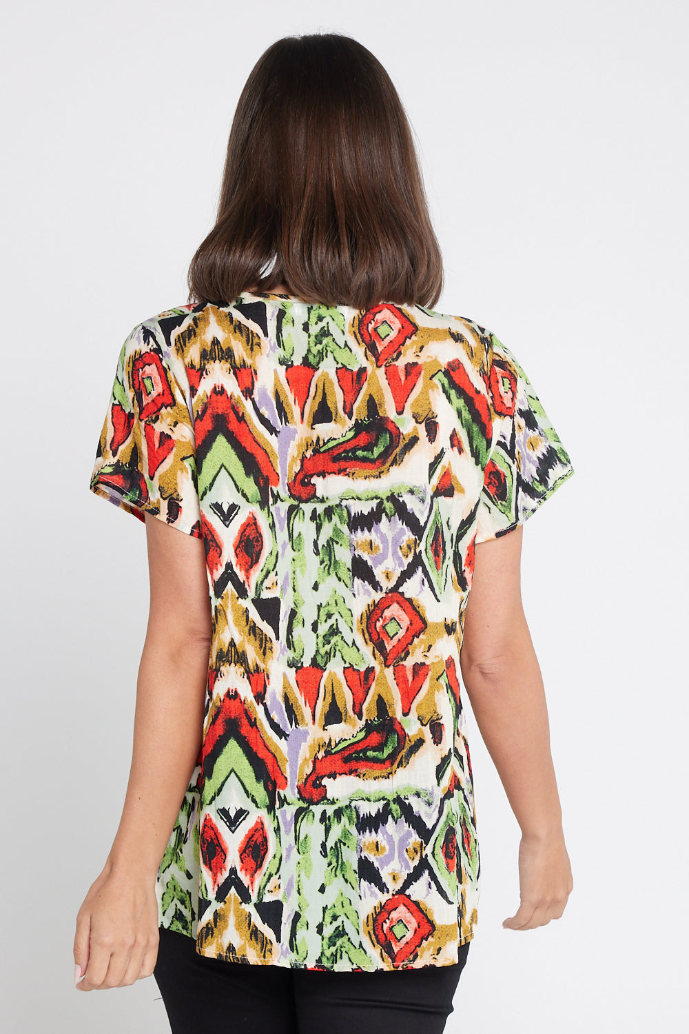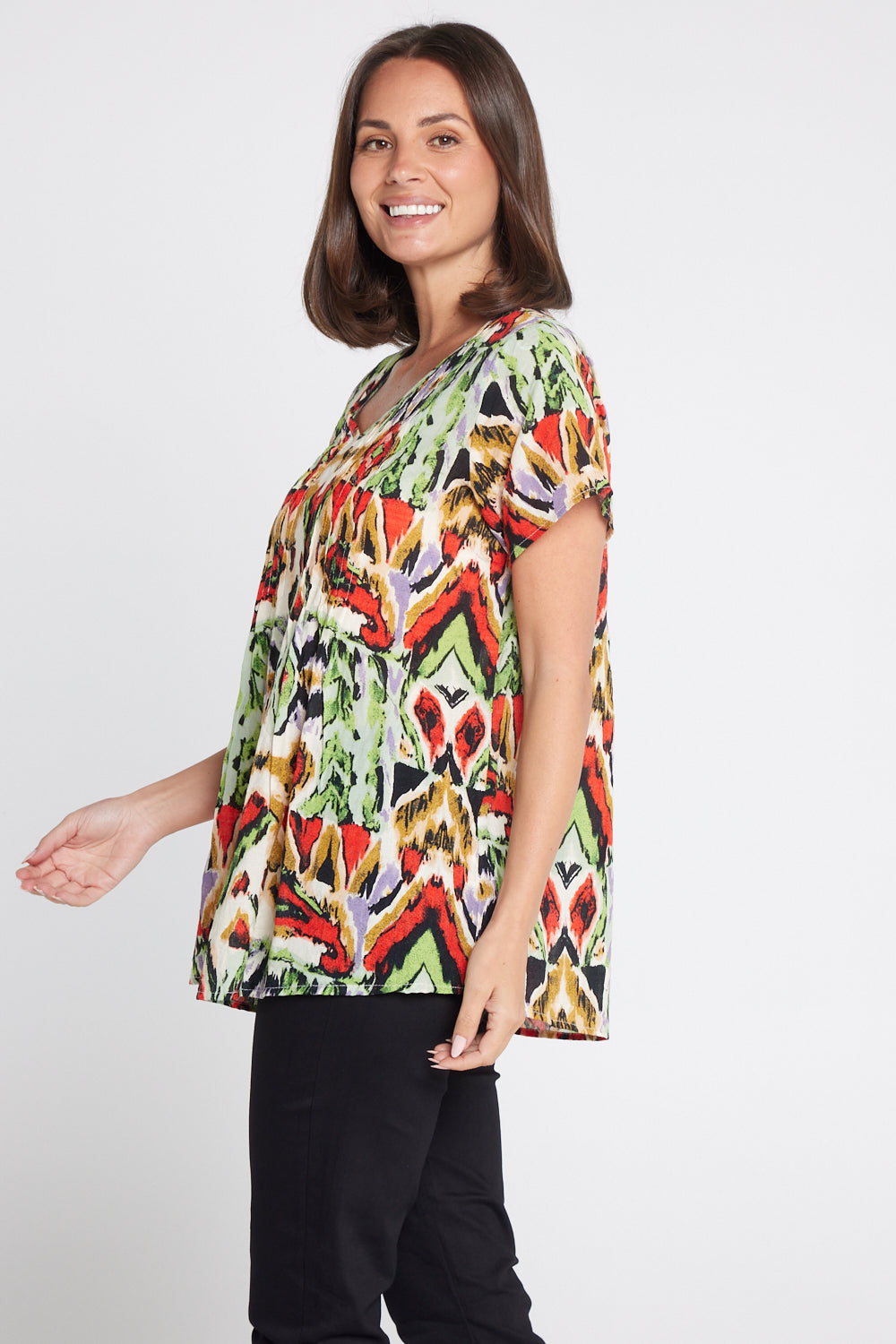 Embrace comfort and breathability in style with the Carmody Cotton Top. The lightweight, non-stretch weave gives this top a cool, comfortable fit. The Tuxedo pleats over the bust and curved hemline give it an elegant touch, while the ikat print in complimentary tones is just perfect for summer.