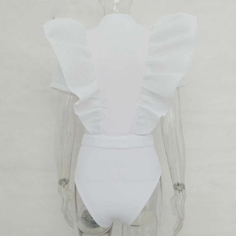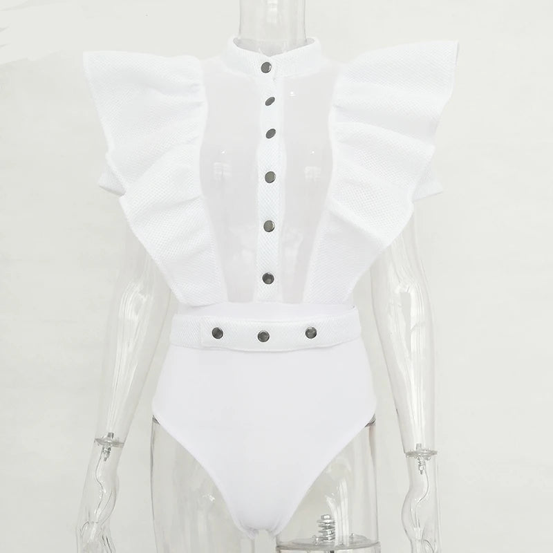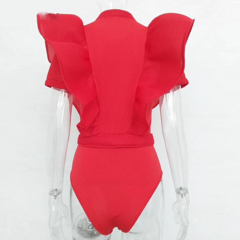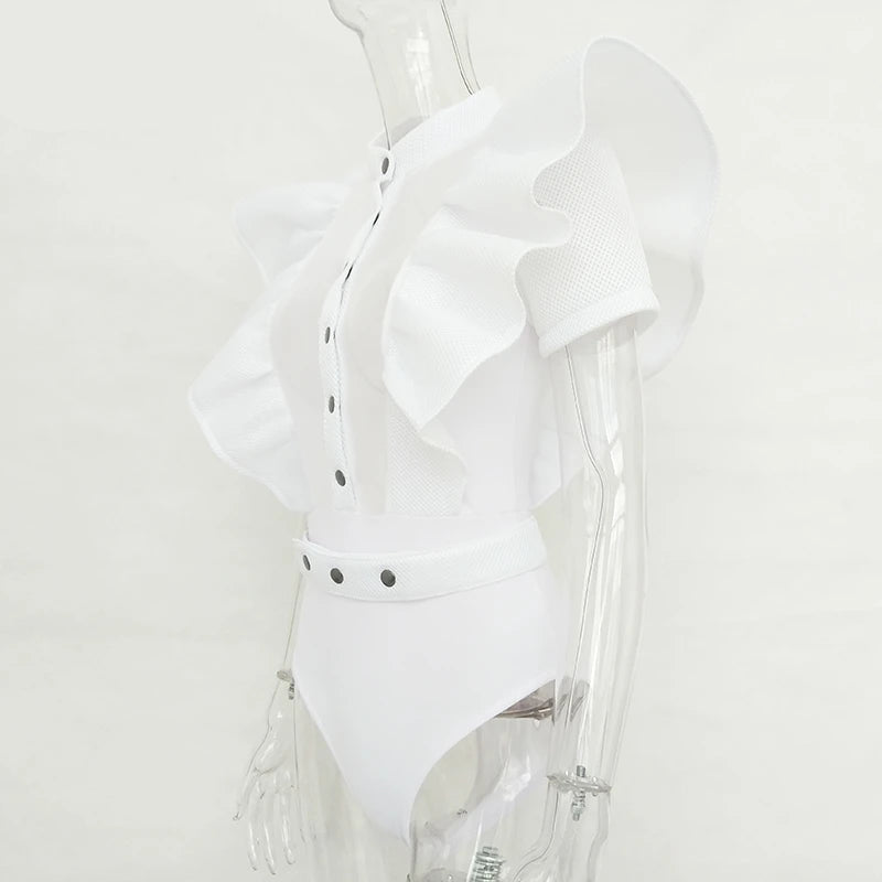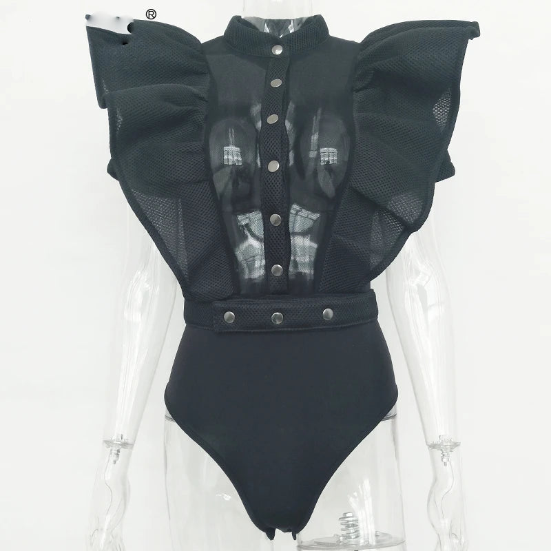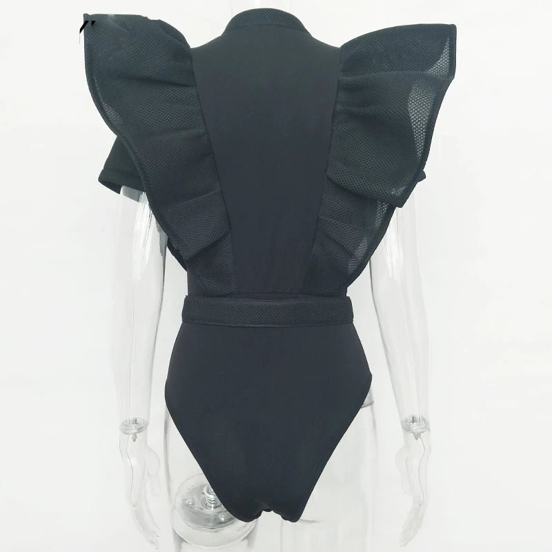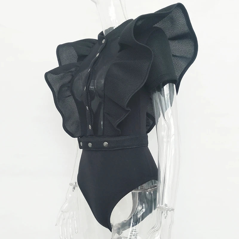 Casual Black Ruffles Hollow Out Short Sleeve Women Bodysuit Top