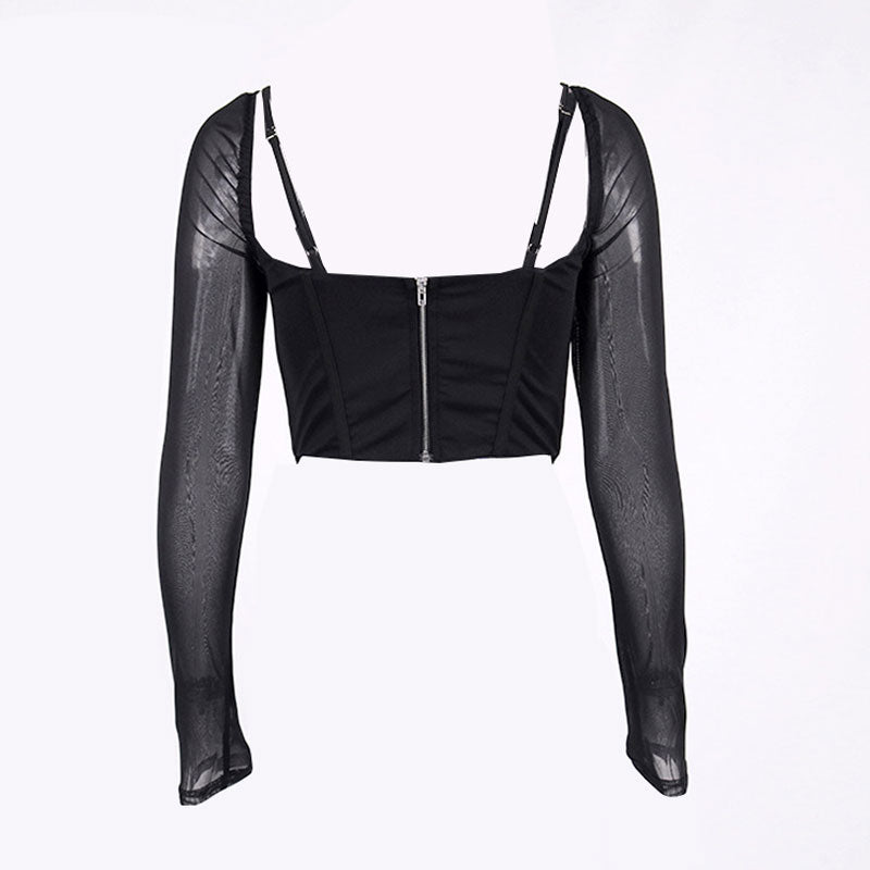 Square Neck Mesh Long Sleeve Ruched Cropped Corset Top - Black