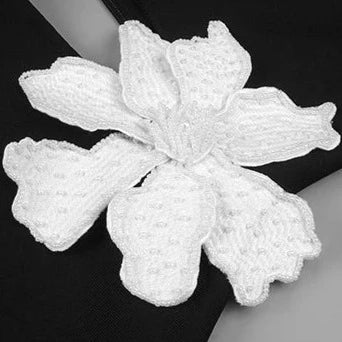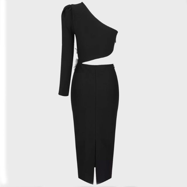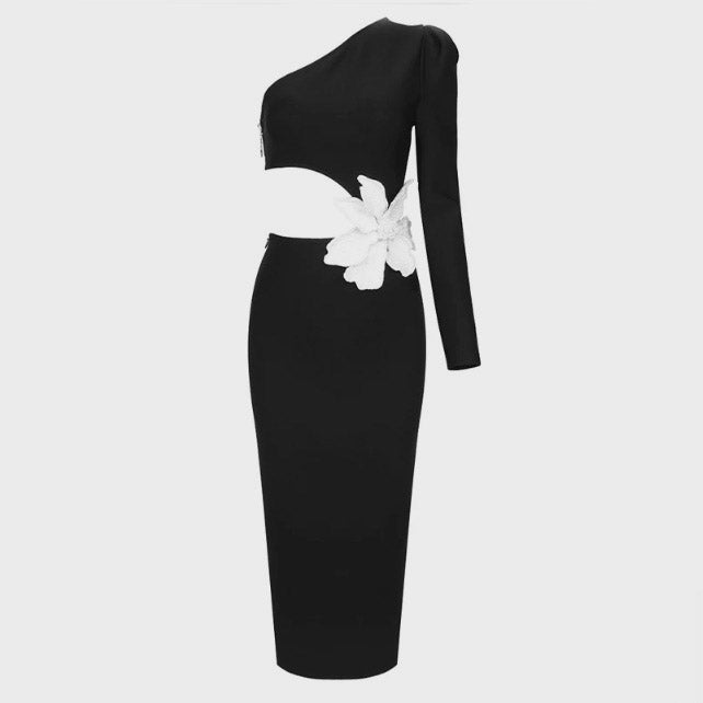 Black ONE SHOULDER MIDI Dress with FLowER ON THE SIDE
