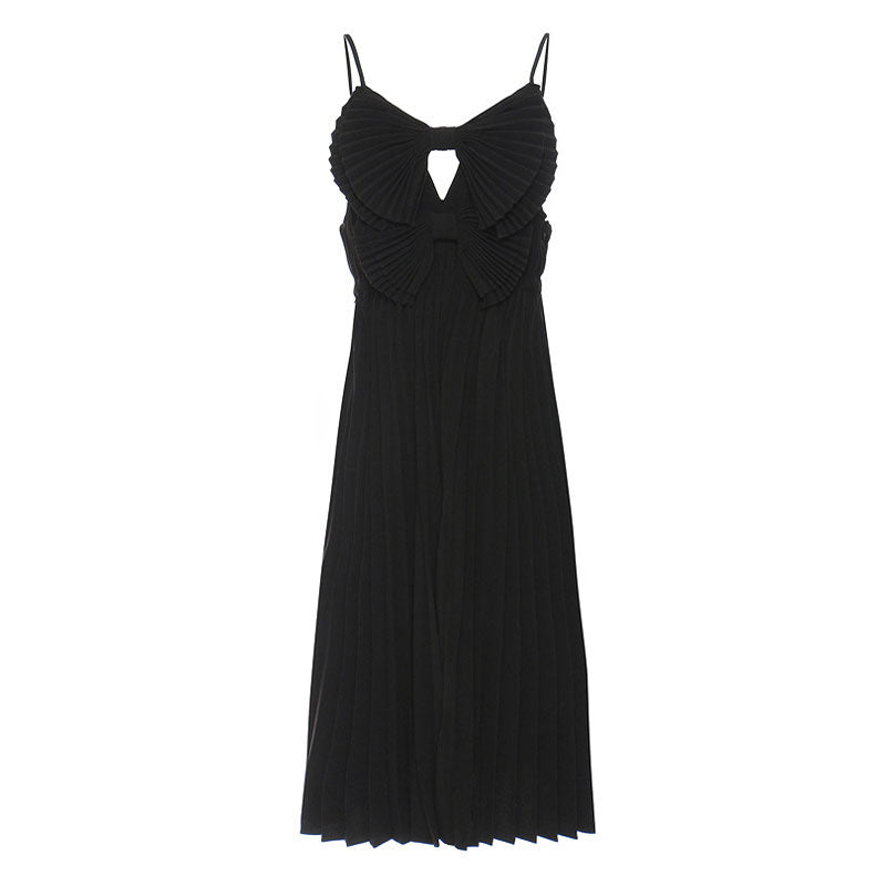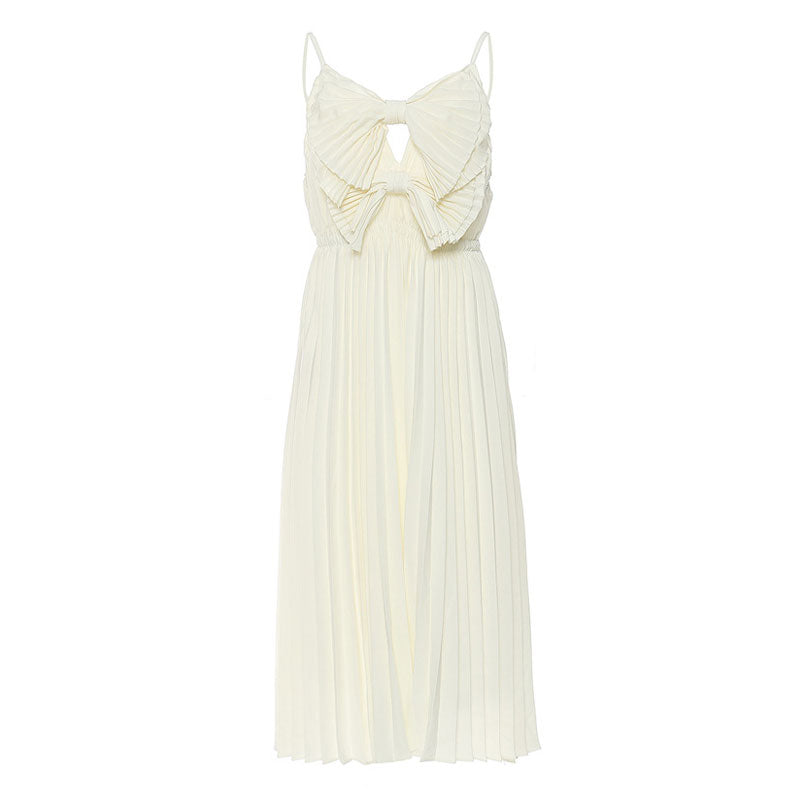 Why stop at one? This breezy slip dress featured double bows down the front. giving the design some feminine flair. The chic V-neckline enhances your allure. while the cute bows bring a playful and flirty twist to the look. Crafted from delicate pleated chiffon. this classy designer midi dress with thin shoulder straps exudes a graceful flow. ensuring effortless movement and unparalleled comfort throughout the day. Whether you're heading to a brunch date. a summer soiree. or a casual gathering. this designer bow dress is the perfect choice for all occasions. Let your inner fashionista shine with this sweet and stylish summer sleeveless dress.