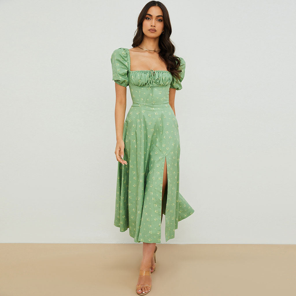 Daisy Printed Puff Sleeve High Slit Smock Maxi Sundress - Sage Green