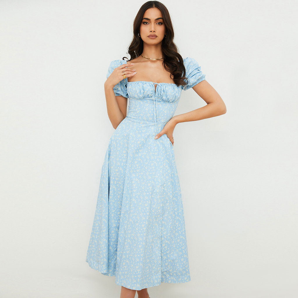 Daisy Printed Puff Sleeve High Slit Smock Maxi Sundress - Sky Blue