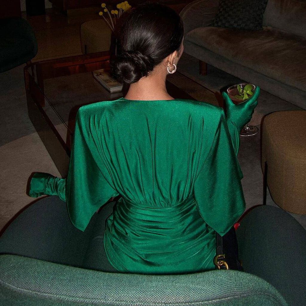 Elegant Draped Shoulder Pad Glove Sleeve V Back Ruched Bodycon Mini Dress