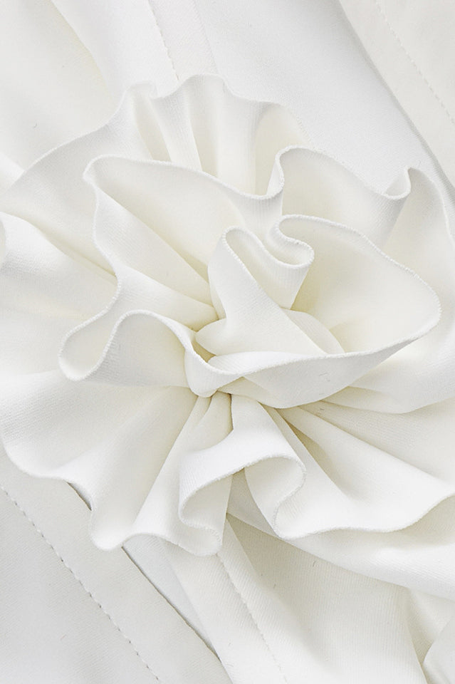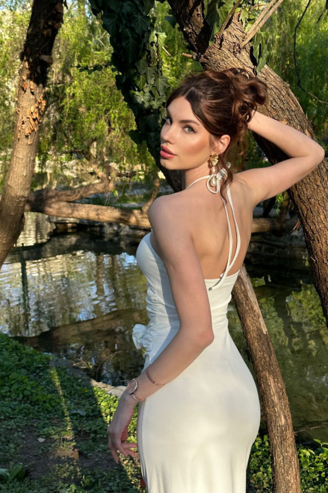 This elegant white maxi dress is a stunning choice for women seeking a fashionable gown outfit. It falls under the evening collection of dresses and is designed to enhance your style and confidence. With its halter tie around the neck. an open back. daring cutouts at the front with three vivid rosette flowers and ruching detail at the sides of the fitted bodice. and a floor-length dress cut. the glamorous maxi flower dress in our boutique is meticulously crafted to accentuate your curves in the right places. Whether it’s a formal event or a special occasion. this sexy sleeveless dress is a must-have addition to your wardrobe.
