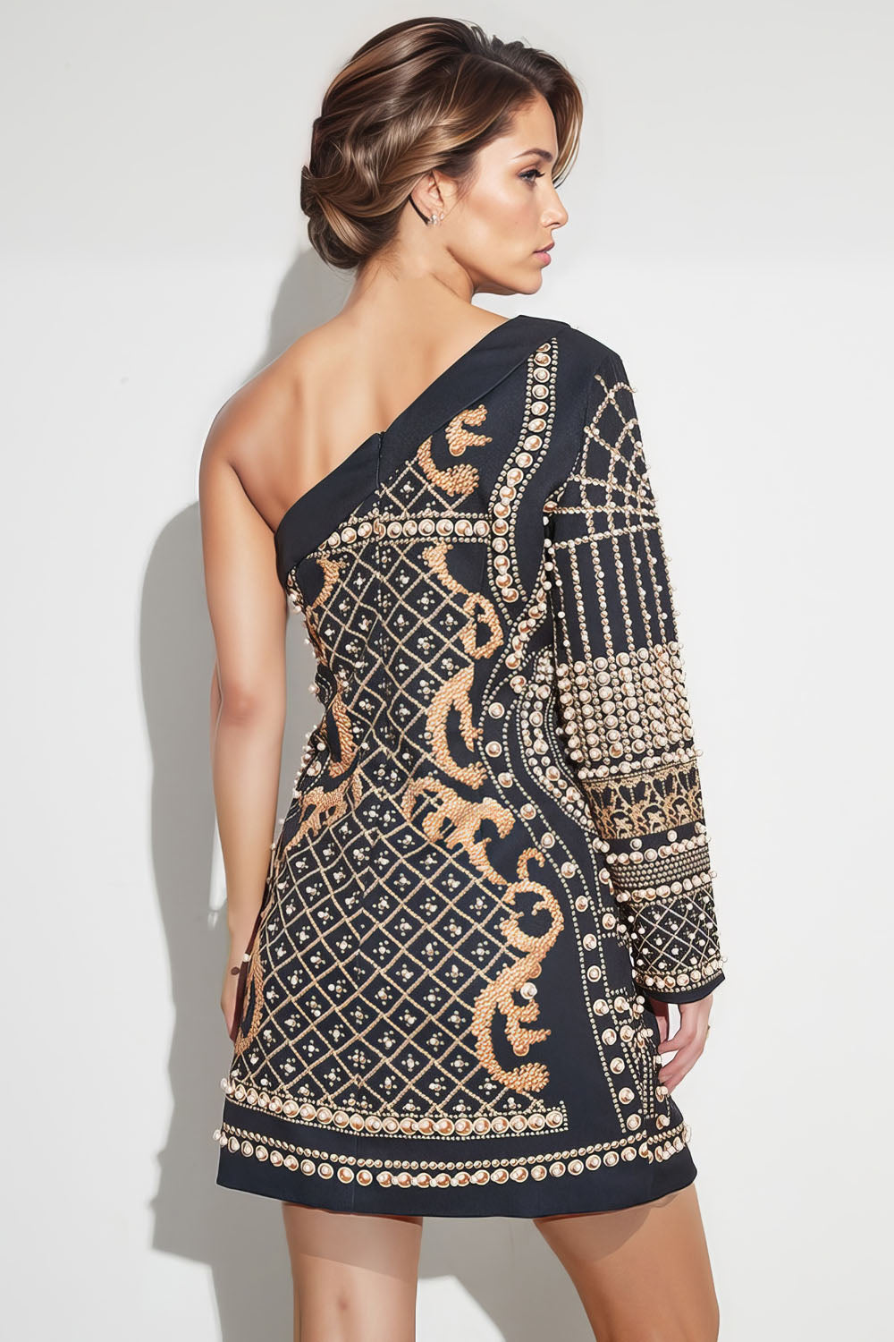 Add a bit of sparkle to your wardrobe with this One Shoulder Patterned Dress. Featuring a diagonal neckline adorned with gold beads and sequins and a long sleeve. this dress adds a touch of glamour. With a zip-up closure at the back. you'll love the convenience and comfort of this dress.