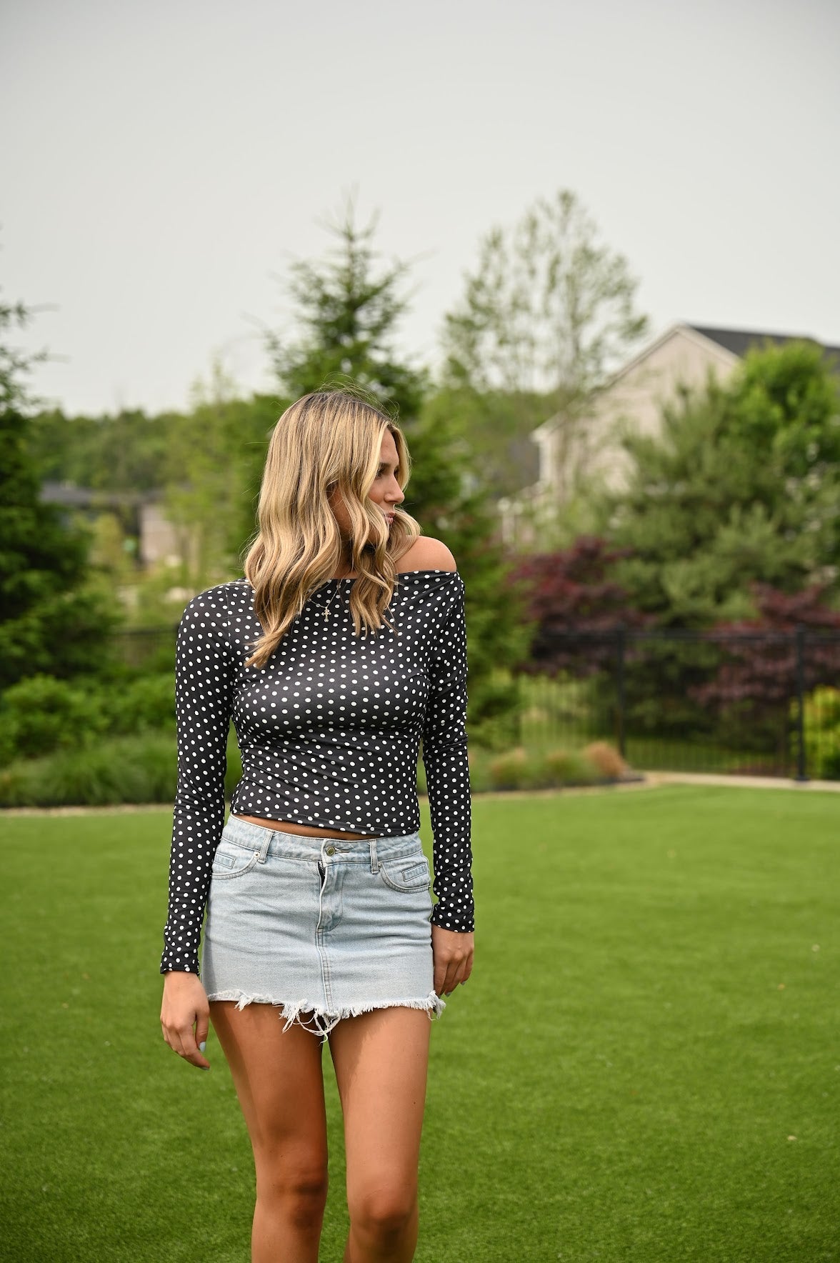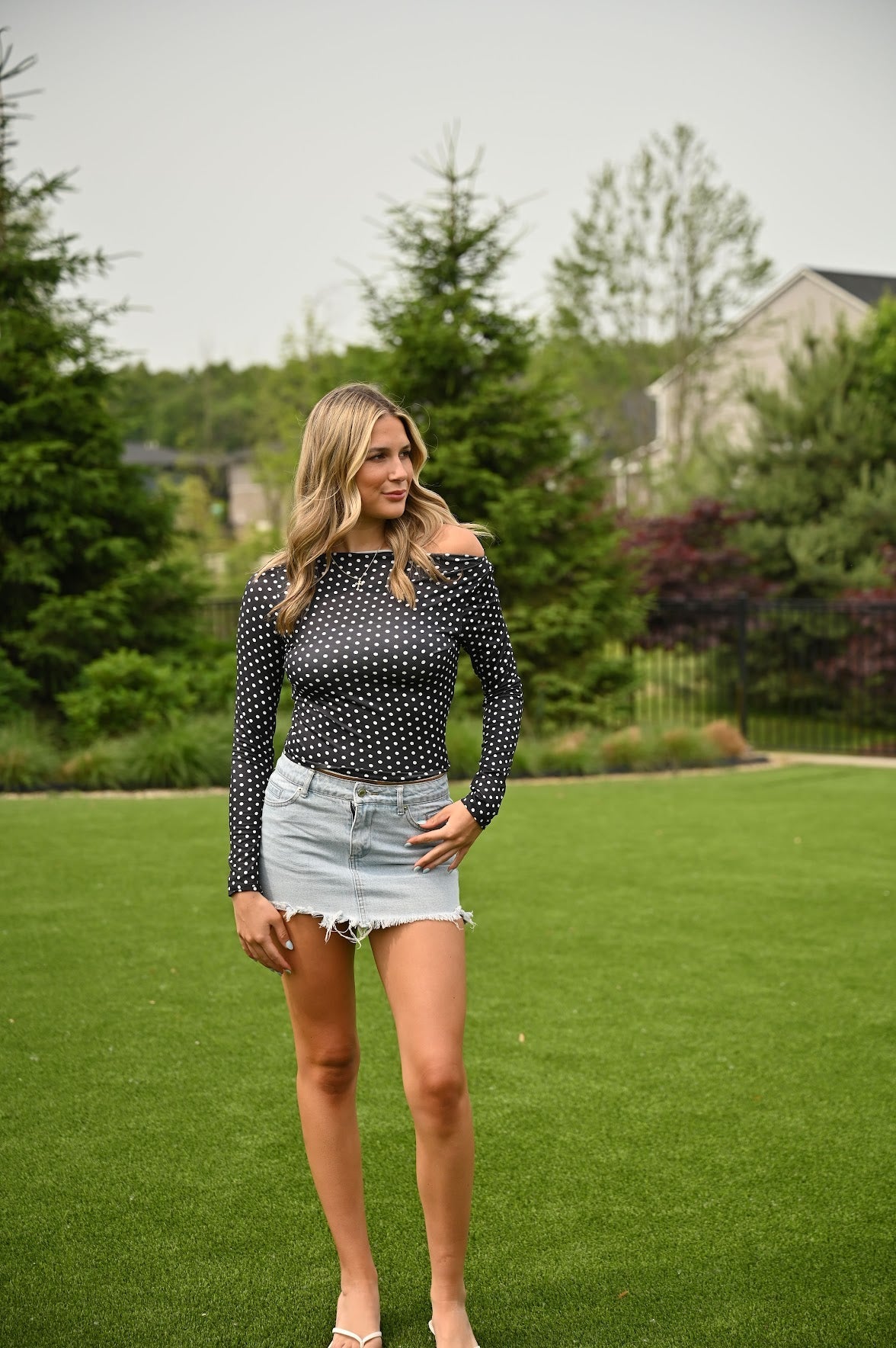 Add some playful style to your wardrobe with the Chrome Top. This fun top features polka dot long sleeves, sure to make a statement wherever you go. Perfect for adding a touch of quirkiness to any outfit!