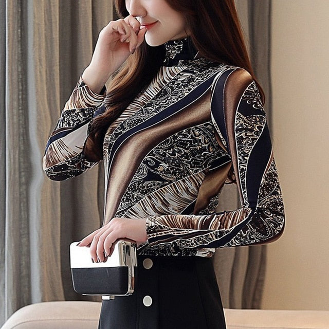 Turtleneck Blouse With Print Pattern, Broadcloth Fabric Type, And Polyester Material