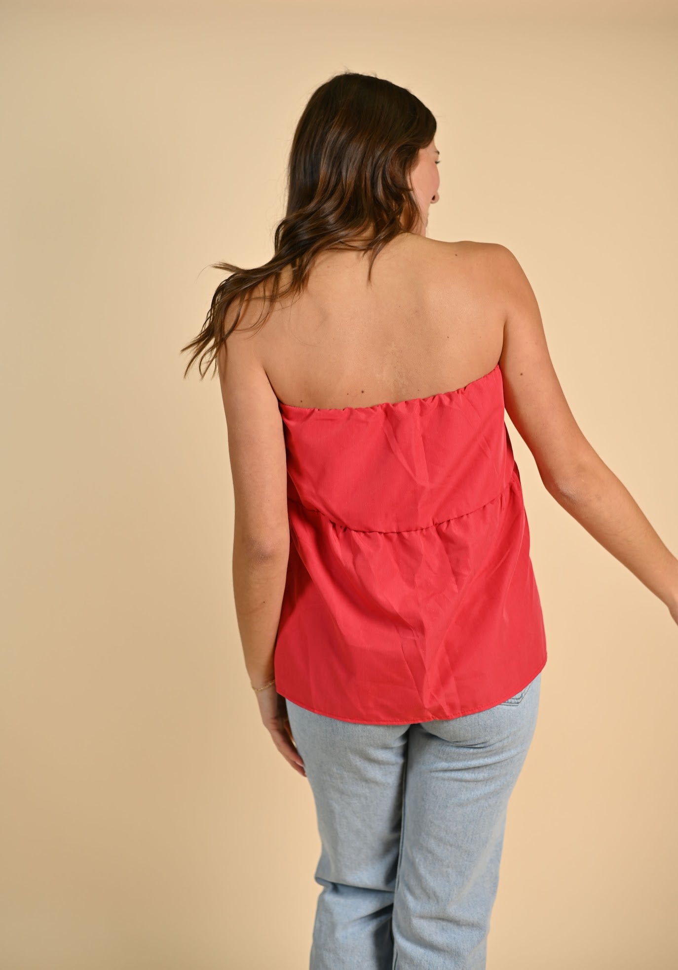 Elevate your style with this chic strapless top, available in a variety of colors. Featuring a flattering, gathered waist and a flowing, layered design, this top is perfect for both casual outings and evening events. Pair it with jeans, skirts, or shorts for a versatile and effortlessly stylish look.