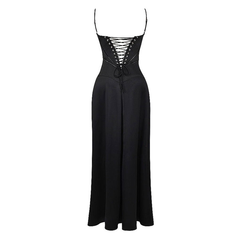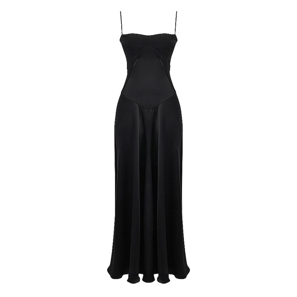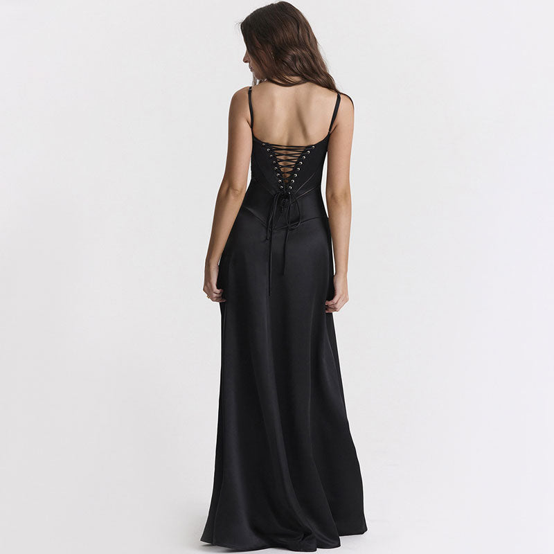 Elegant Lace Up Spaghetti Strap Fit and Flare Satin Maxi Evening Dress
