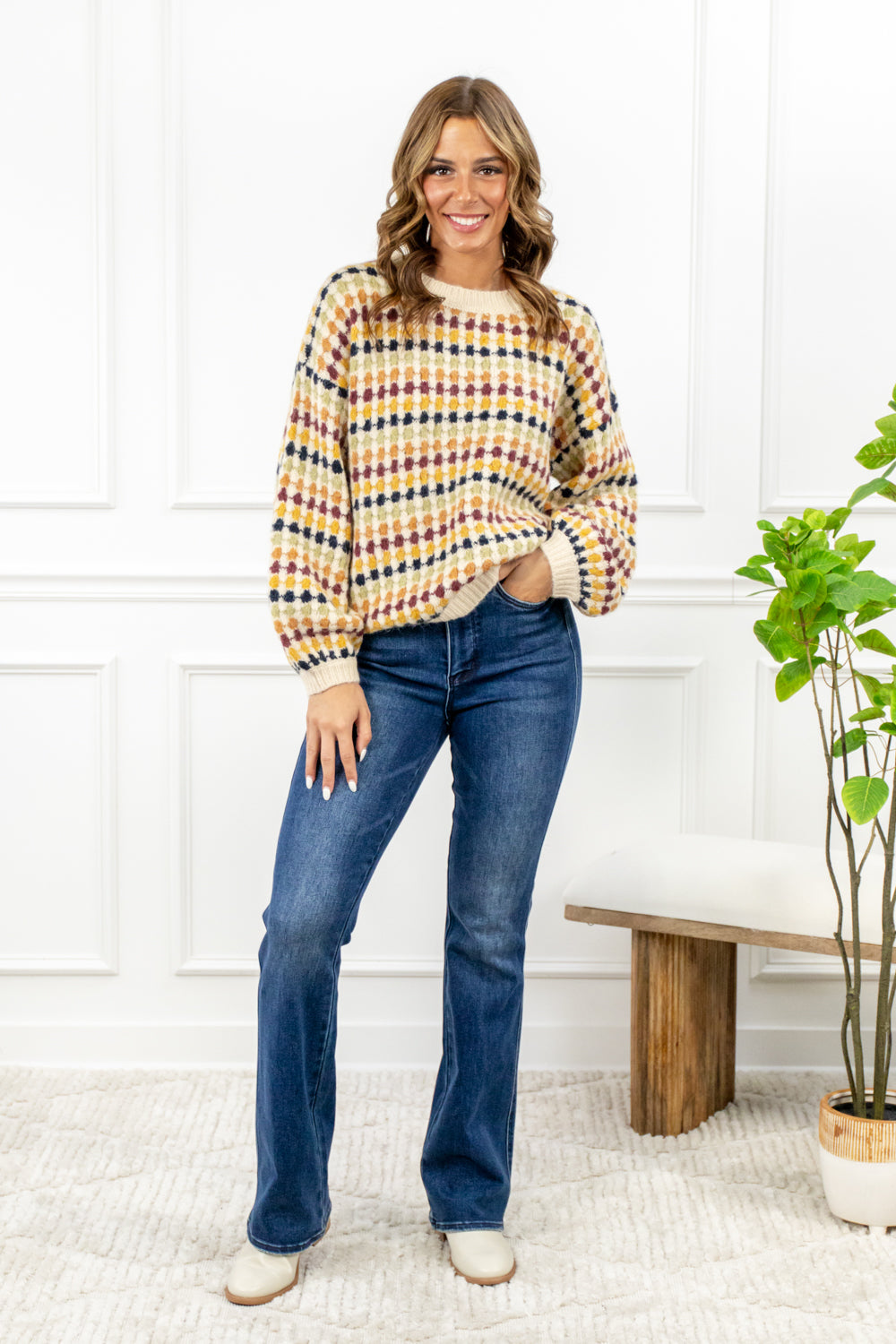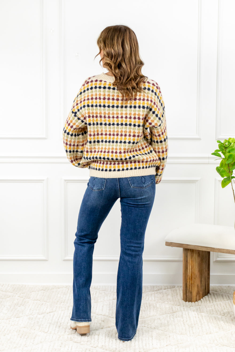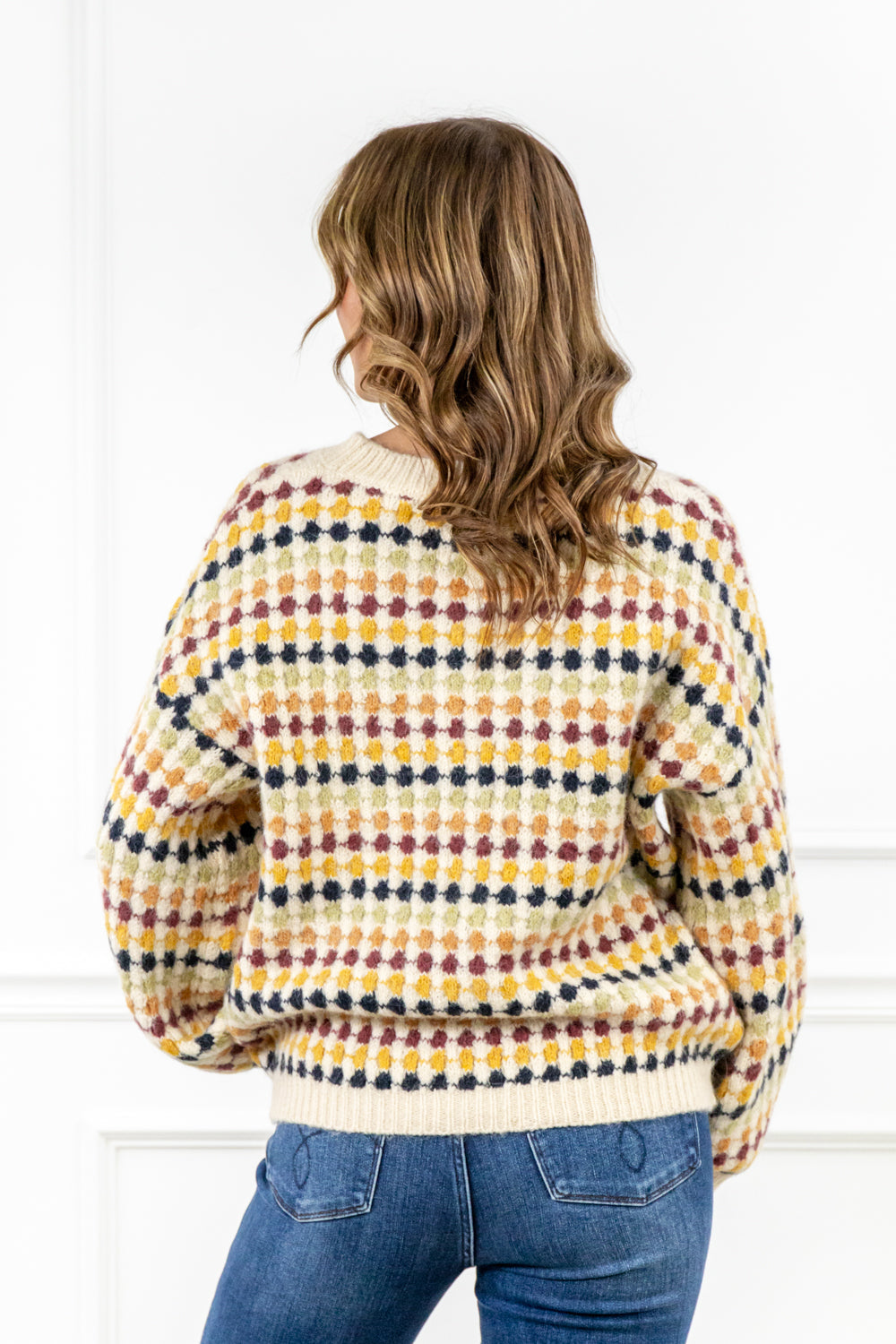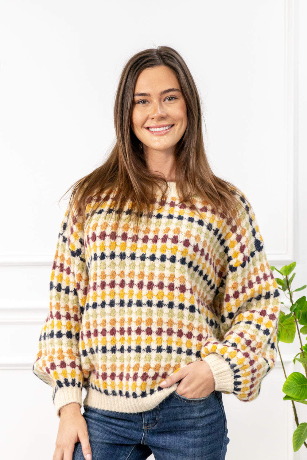 Cozy up in style with this must-have checkered sweater. The soft, textured knit fabric features a mini checkered pattern in warm tones, adding a touch of classic charm to your wardrobe. The relaxed fit and slightly boxy silhouette create a flattering and modern look, while the ribbed hem and cuffs offer a cozy finish. Perfect for pairing with your favorite denim or layering over a collared shirt for a touch of preppy flair.