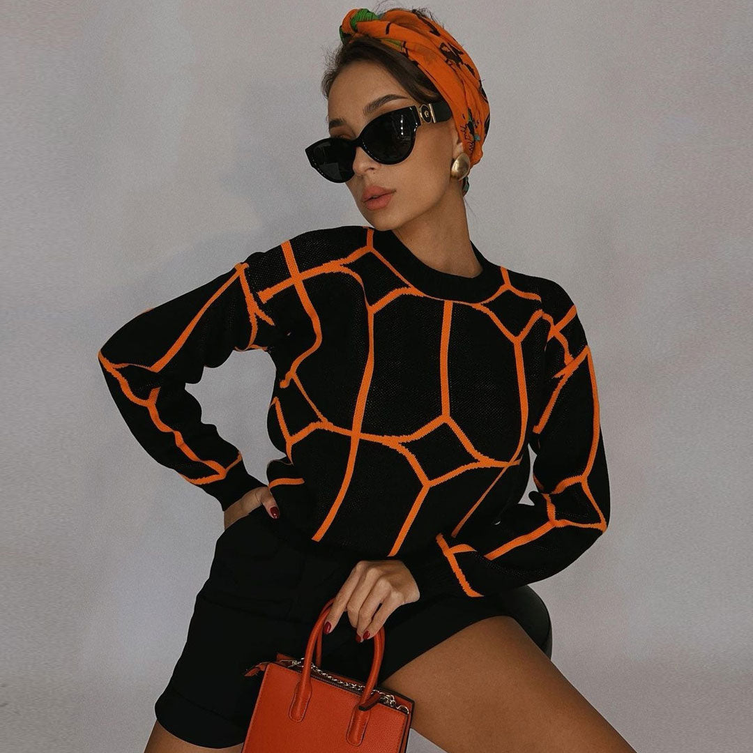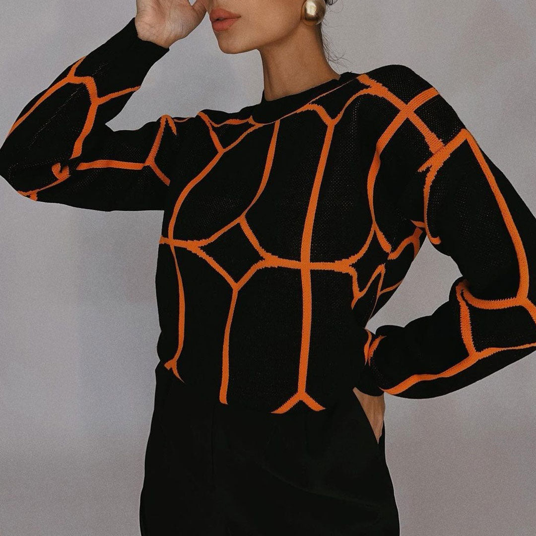 Say hello to your new everyday warm knitted sweater. Made of ribbed knit and cotton blend. embellished with geometric patterns accentuated with contrasting color designs. featuring a round neckline. slightly dropped shoulders. long sleeves with banded cuffs. a slip-on silhouette trimmed with ribbed details. a relaxed fit finished with a middle length. Find more trendy women's long-sleeve sweaters or unique clothing in our boutique. and complete a gorgeous look with a pair of wide-leg pants and block-heel ankle boots.