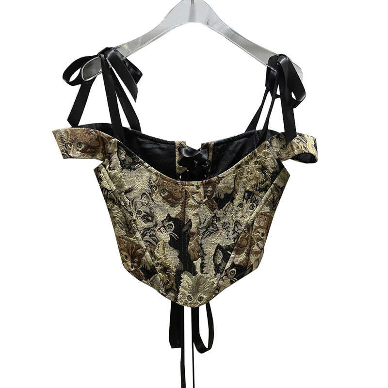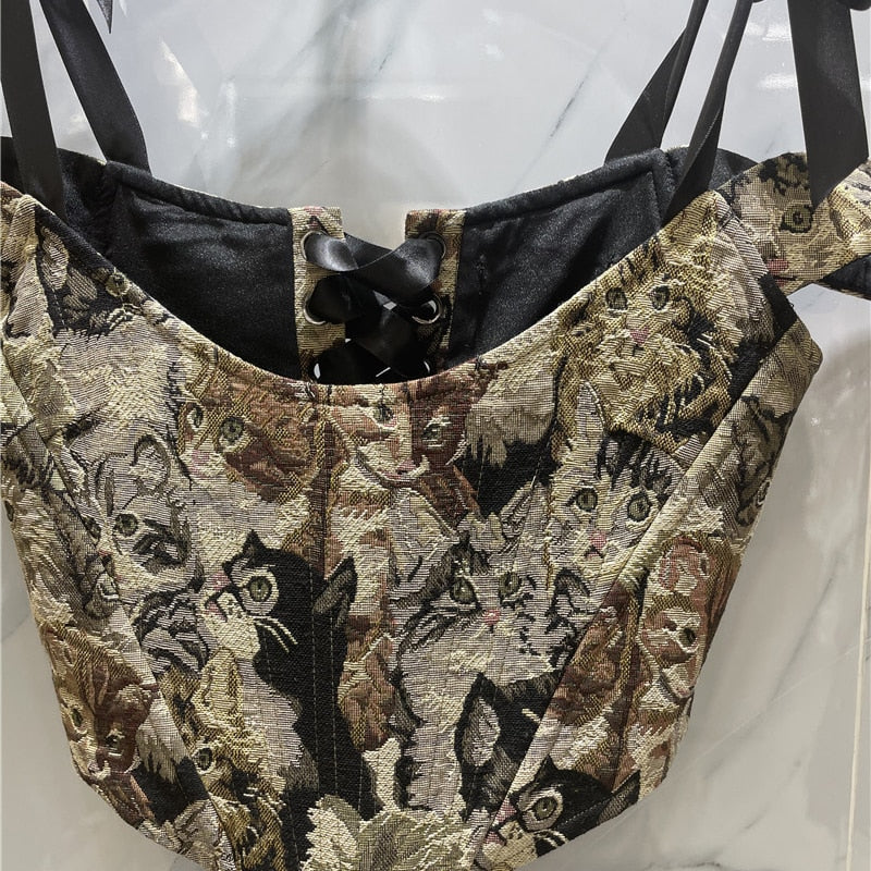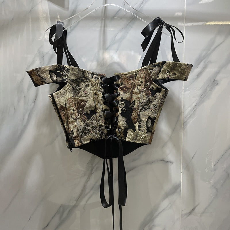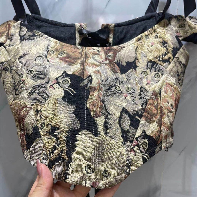 This stylish crop top is a versatile outfit that can be worn for going out with friends. The cat print is a fun way to add personality to your casual wardrobe. Pair with skirts or pants for a stylish look. This crop top is made with a soft polyester blend that feels comfortable and lightweight. Stylish ribbons are featured on the straps for an extra touch of versatility.
