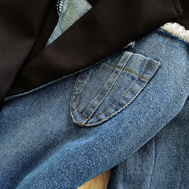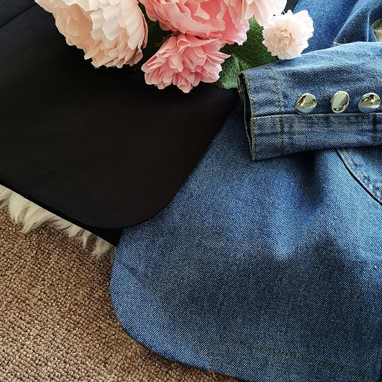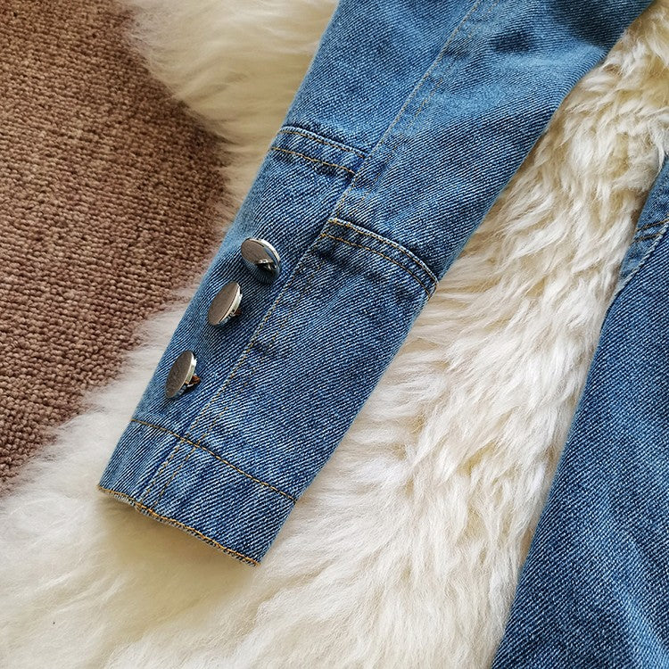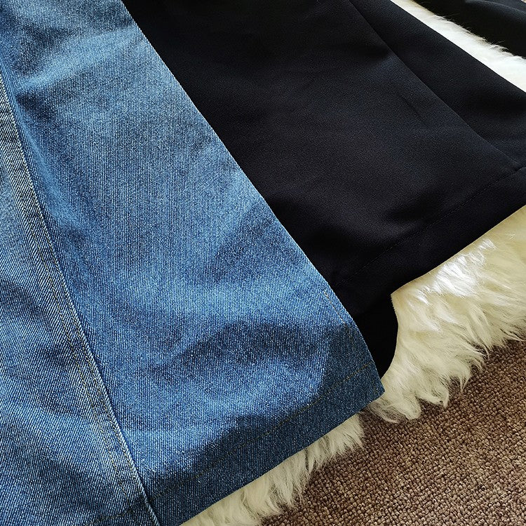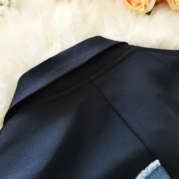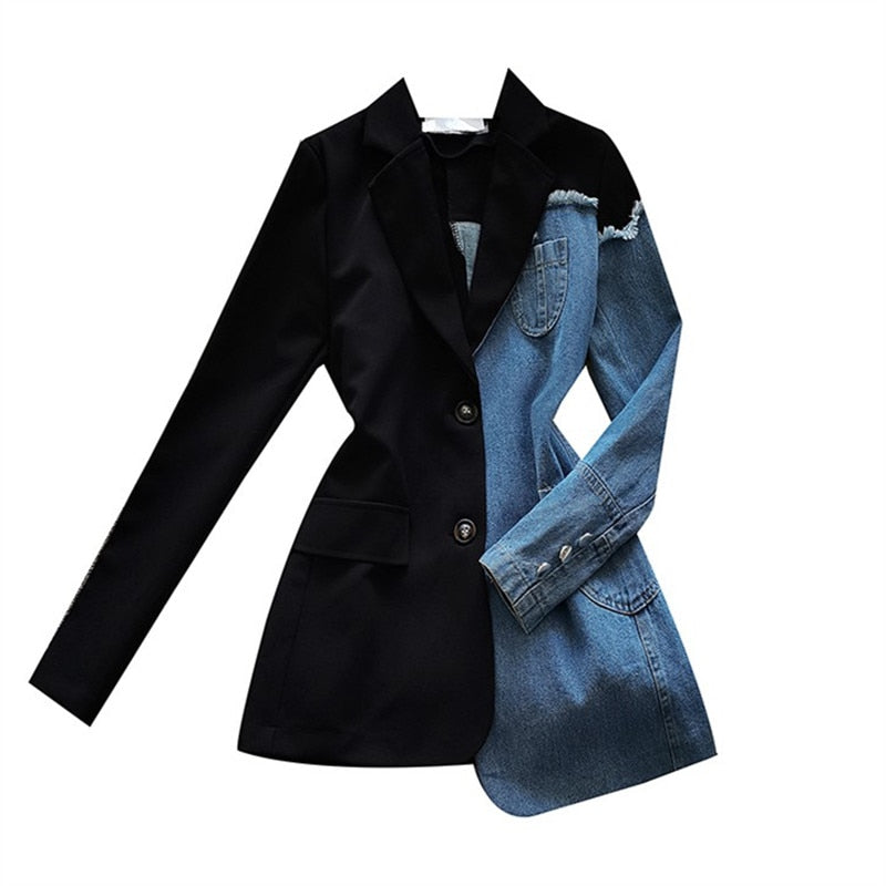 This blazer features a notch lapel and double-button closure. The half-patchwork denim style makes this blazer a statement piece. The asymmetrical cut gives this blazer a unique look as a must-have for your closet.