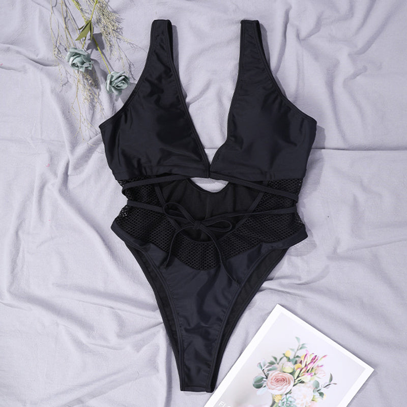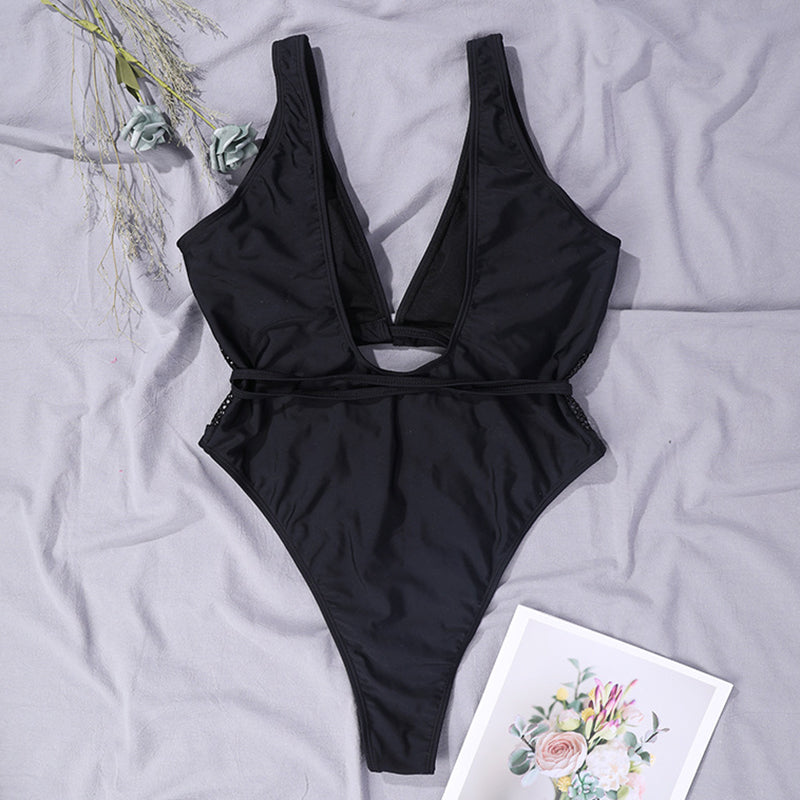 Solid Black Monokini with String Closure and Polyester Spandex Material