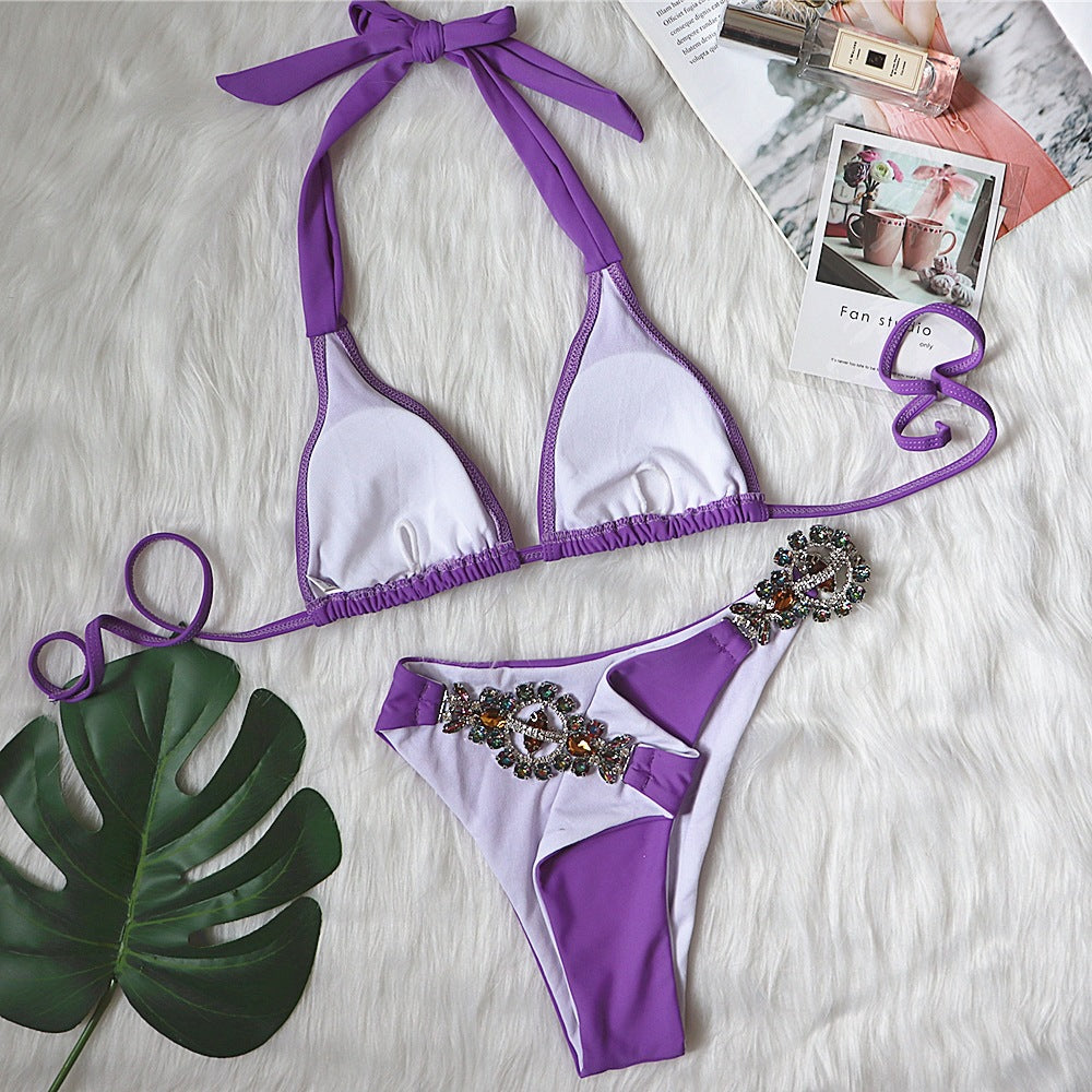 Halter Strap Two Piece Bikini with Geometric Rhinestone Decoration