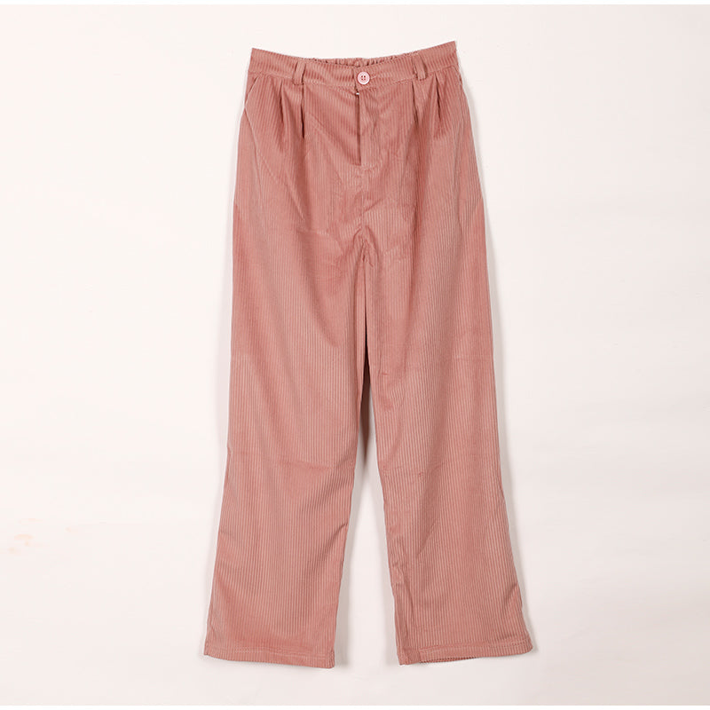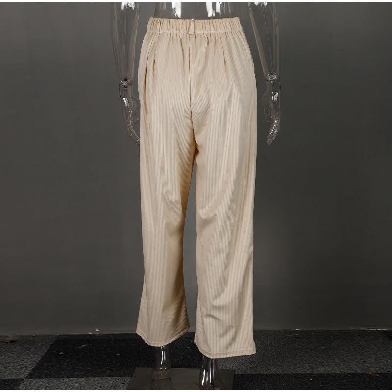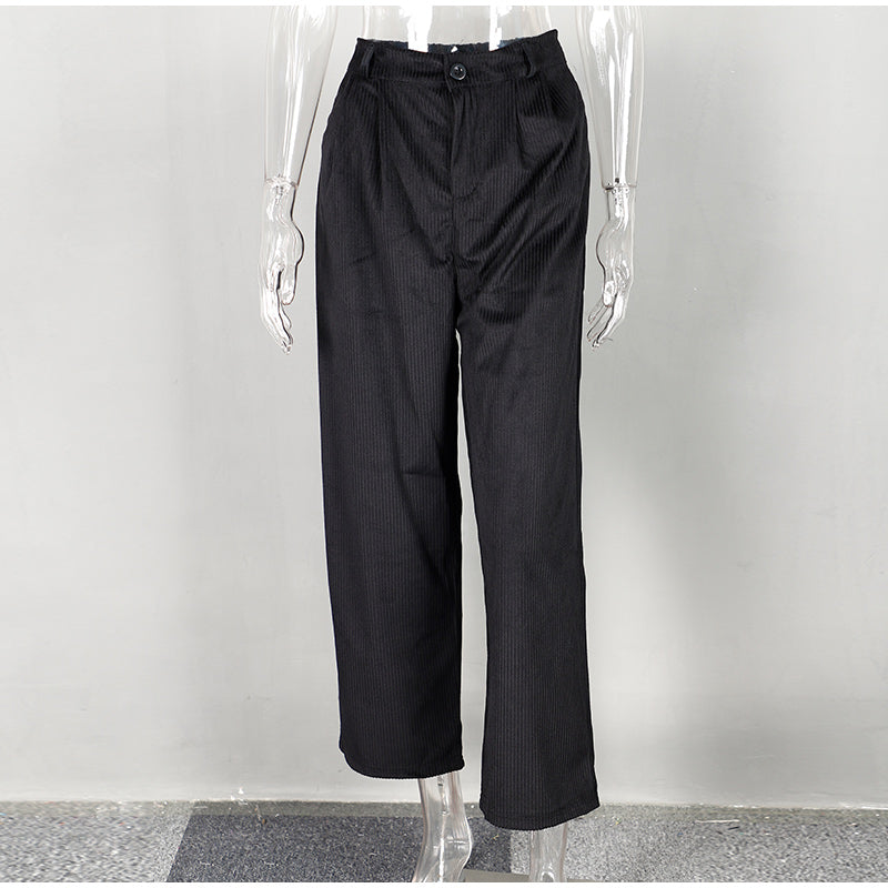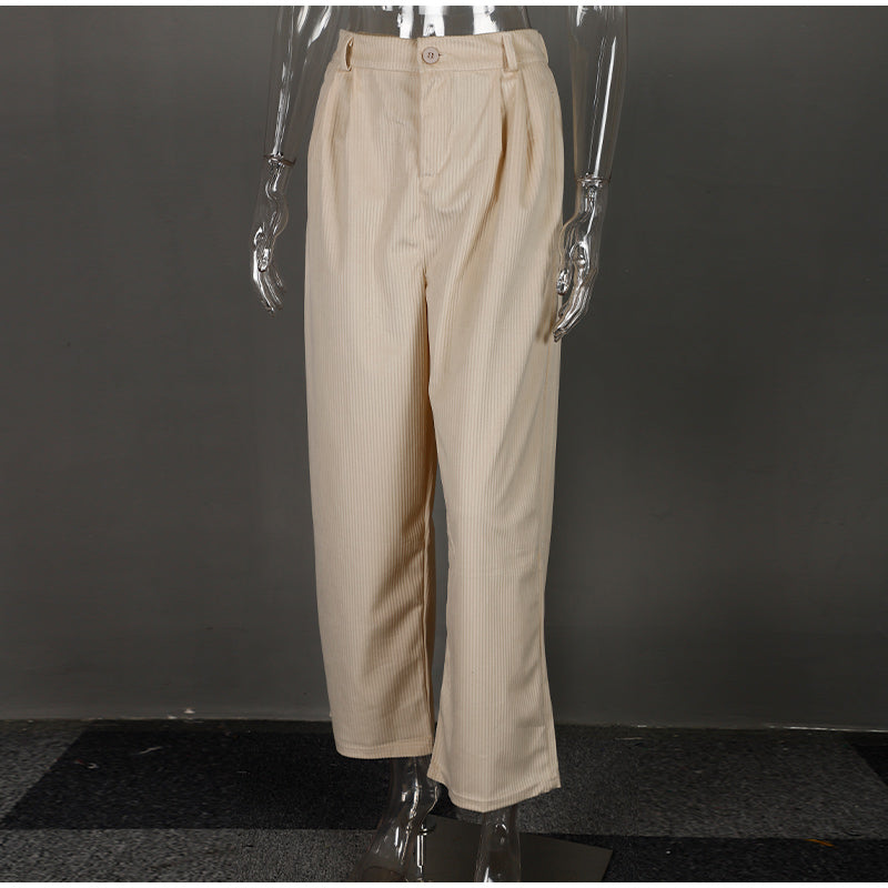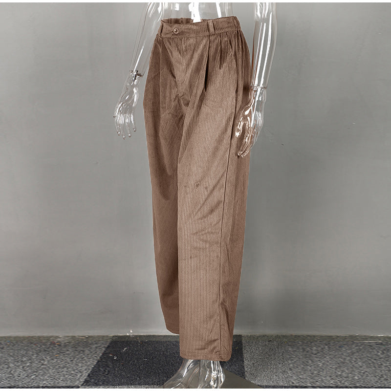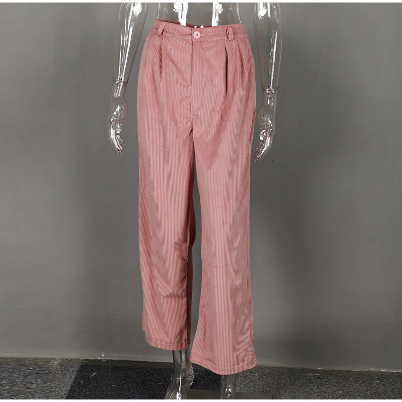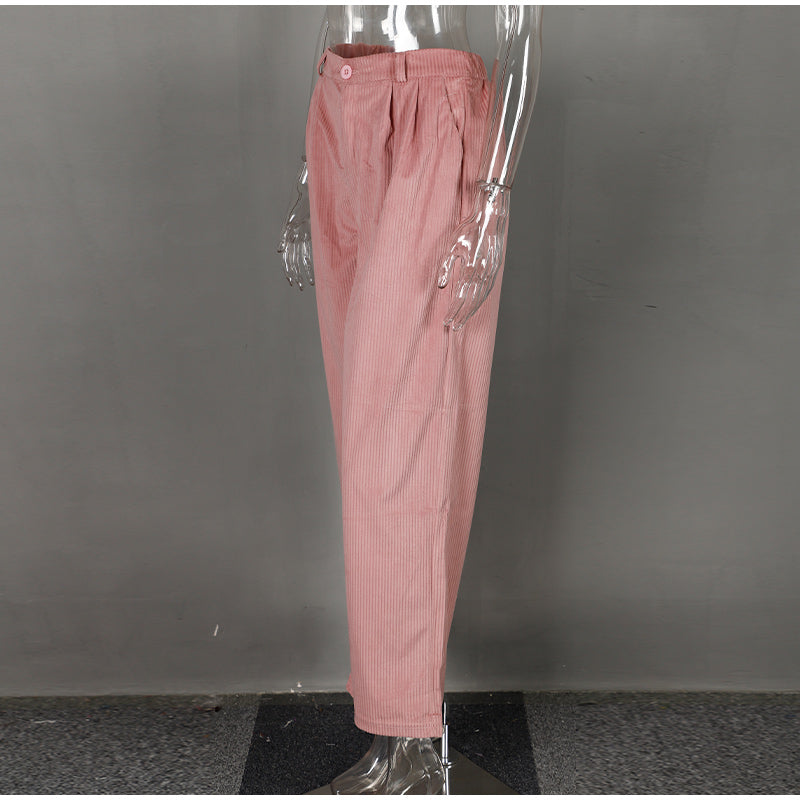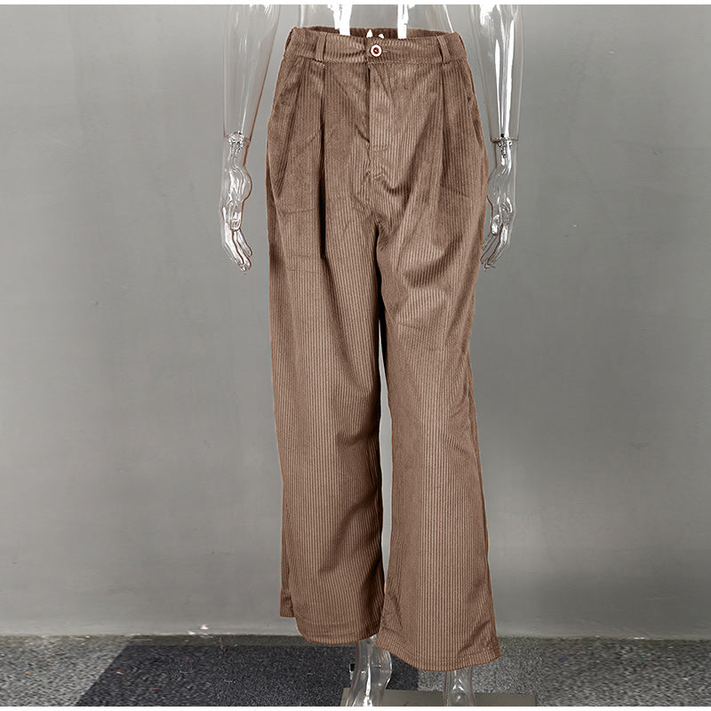 In a relaxed, loose fit, these high-waisted women's pants are perfect for any season. The polyester fabric is soft and comfortable and the solid color ensures that these pants can be worn with any top or sweater. They are fitted at the waist with a button fly.
