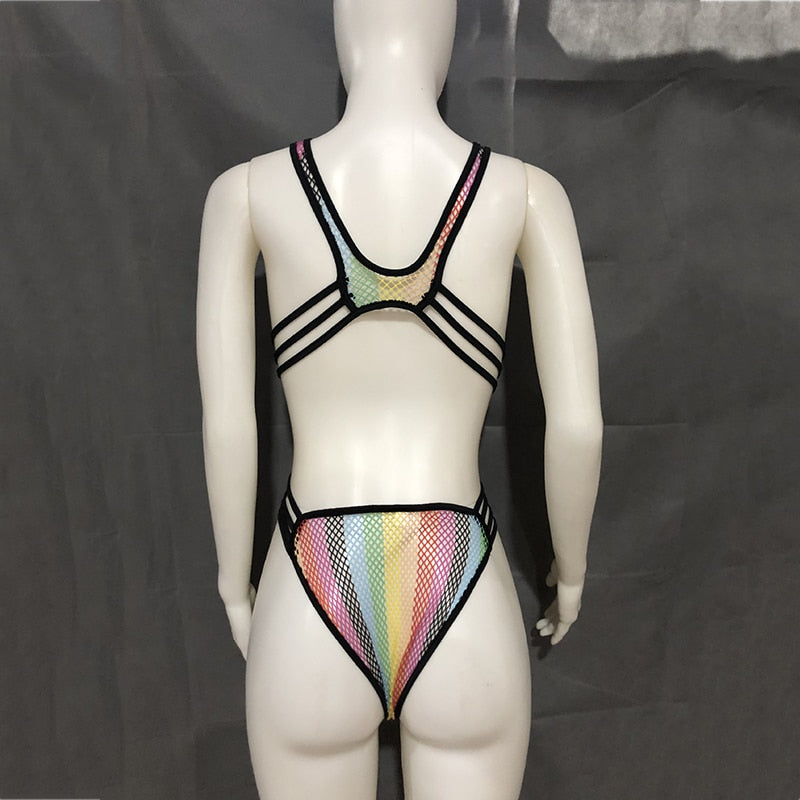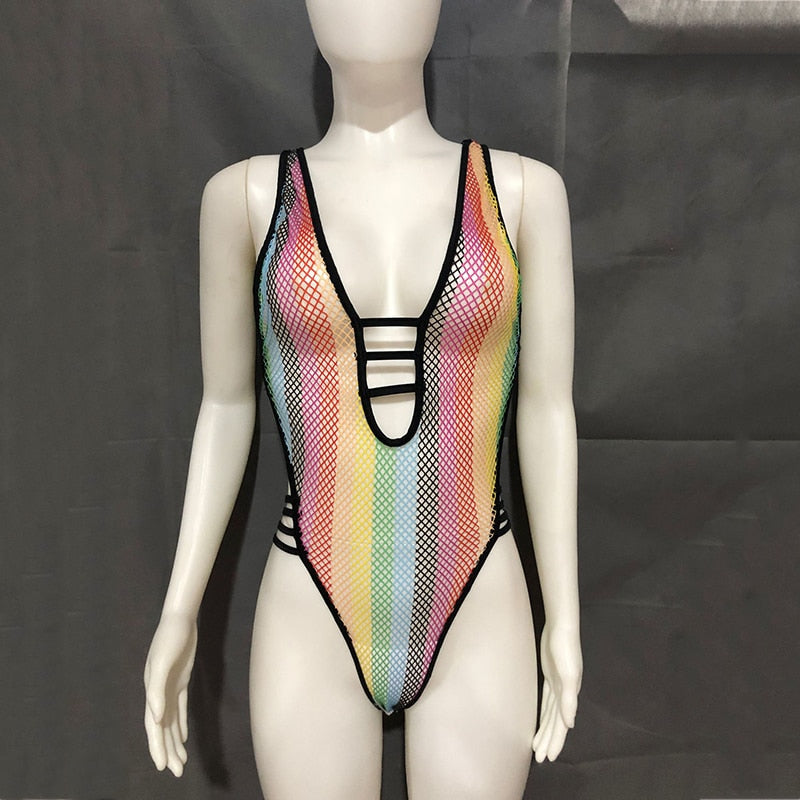 See-Through Polyester Monokini with Rainbow Stripe Design and Halter Style