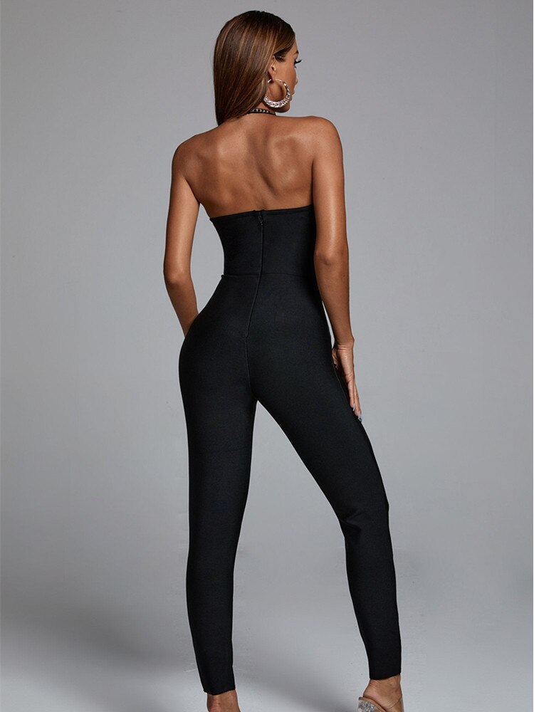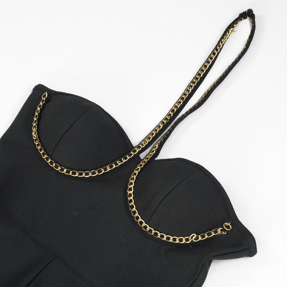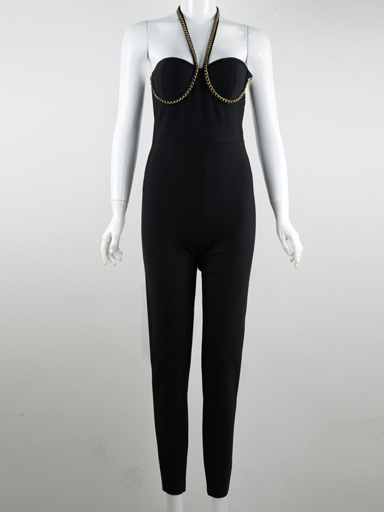 This women's jumpsuit is a great way to add a little fun and color to your wardrobe. The trendy black color has a classic look that is sure to get you noticed. This jumpsuit has a stylish chain trim around the waistline that gives it a fun and flirty look. It is a great way to spice up your look for any occasion.