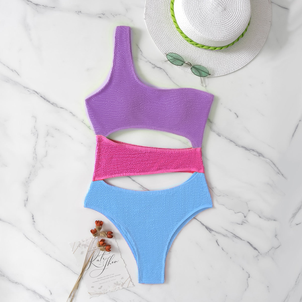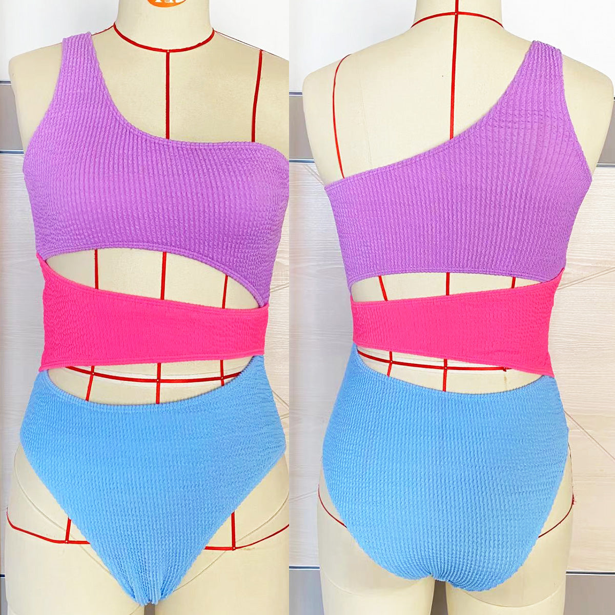 This monokini is designed from three solid colors of fabric that are pieced together in a patchwork style. Comfortable enough to wear all day, the monokini features a flattering one-shoulder strap.