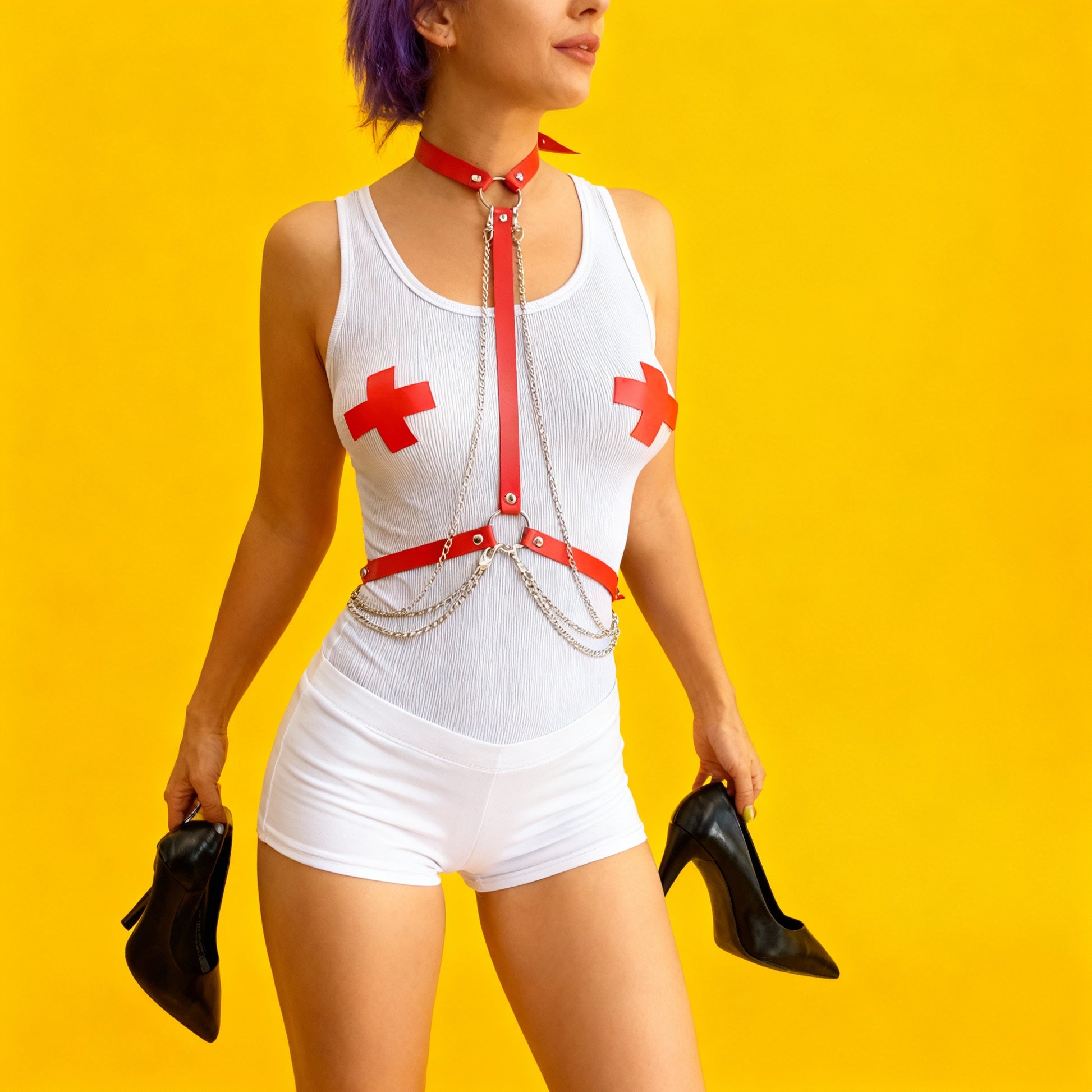 The Crimson Chains Harness is a daring statement of seduction, crafted from supple leather with cascading silver chains that highlight every curve. Designed to captivate, it combines bold restraint with elegant detail, making it the perfect piece for both lingerie layering and unforgettable nights of play. Adjustable straps ensure a flawless fit, while the luxurious finish guarantees both comfort and allure.