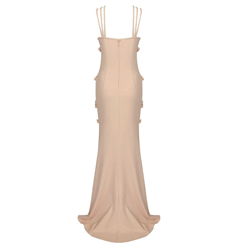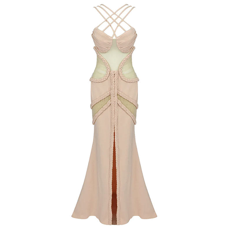 Sexy Criss Cross Braided Mesh CutOut Front Slit Maxi Evening Dress - Dusty Pink