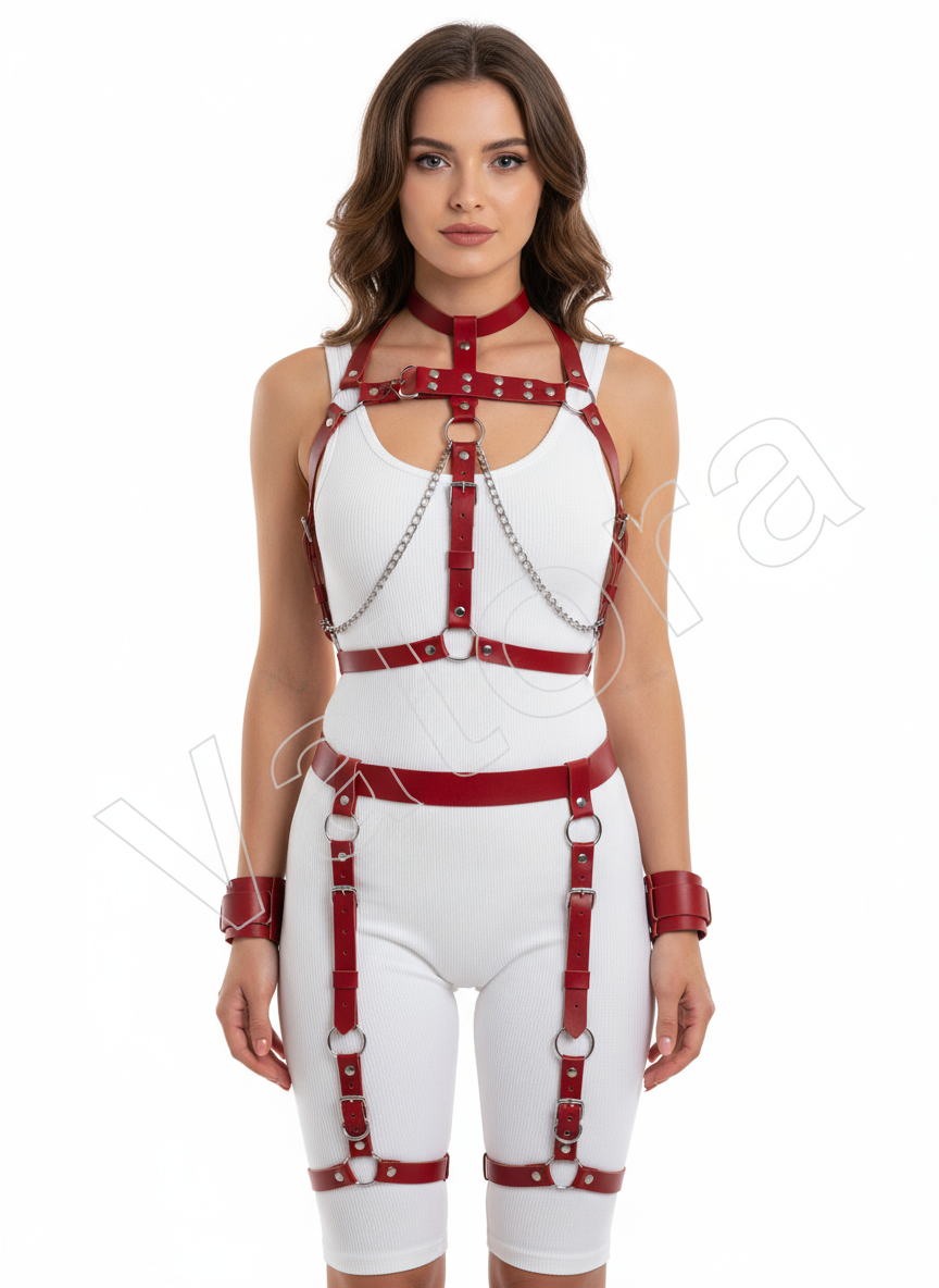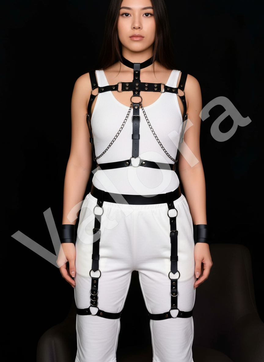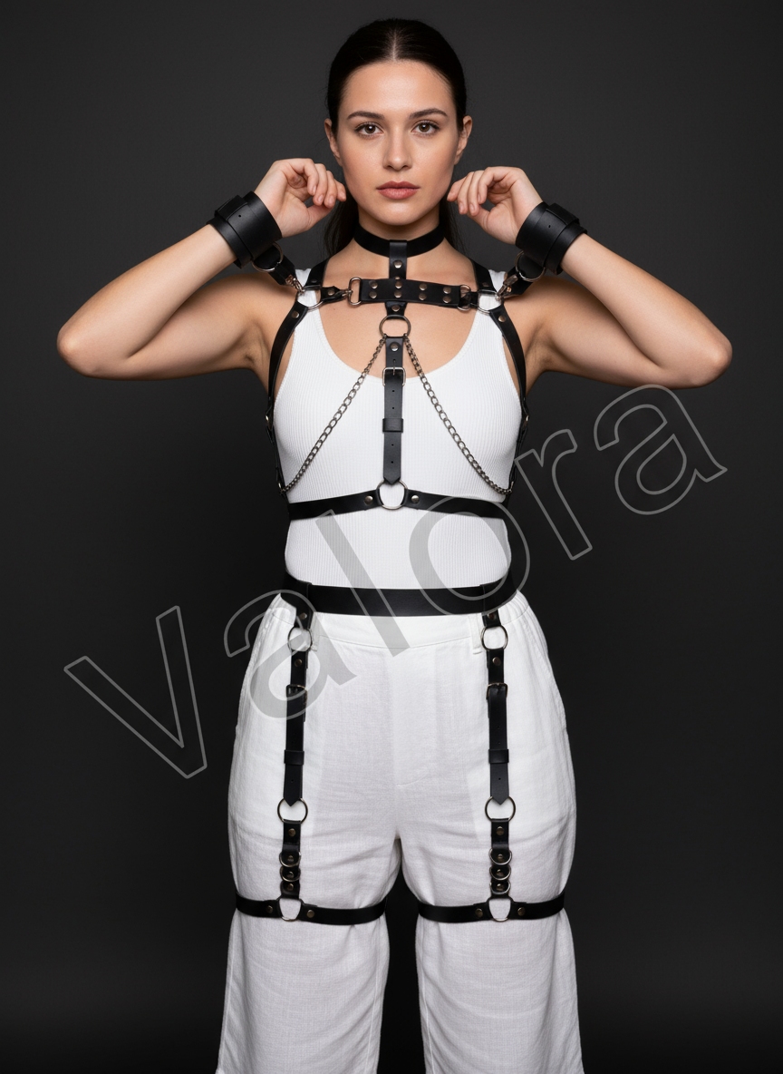 Unleash your boldest fantasies with this captivating leather garter set, complete with adjustable cuffs and chain details that embrace the body with sensual precision. The structured design enhances your curves while offering a provocative, commanding aesthetic perfect for intimate nights. Crafted to balance durability with comfort, it invites both restraint and indulgence.