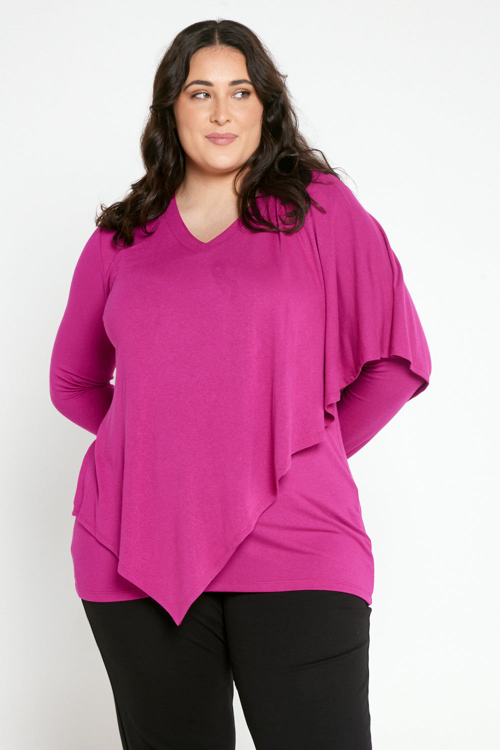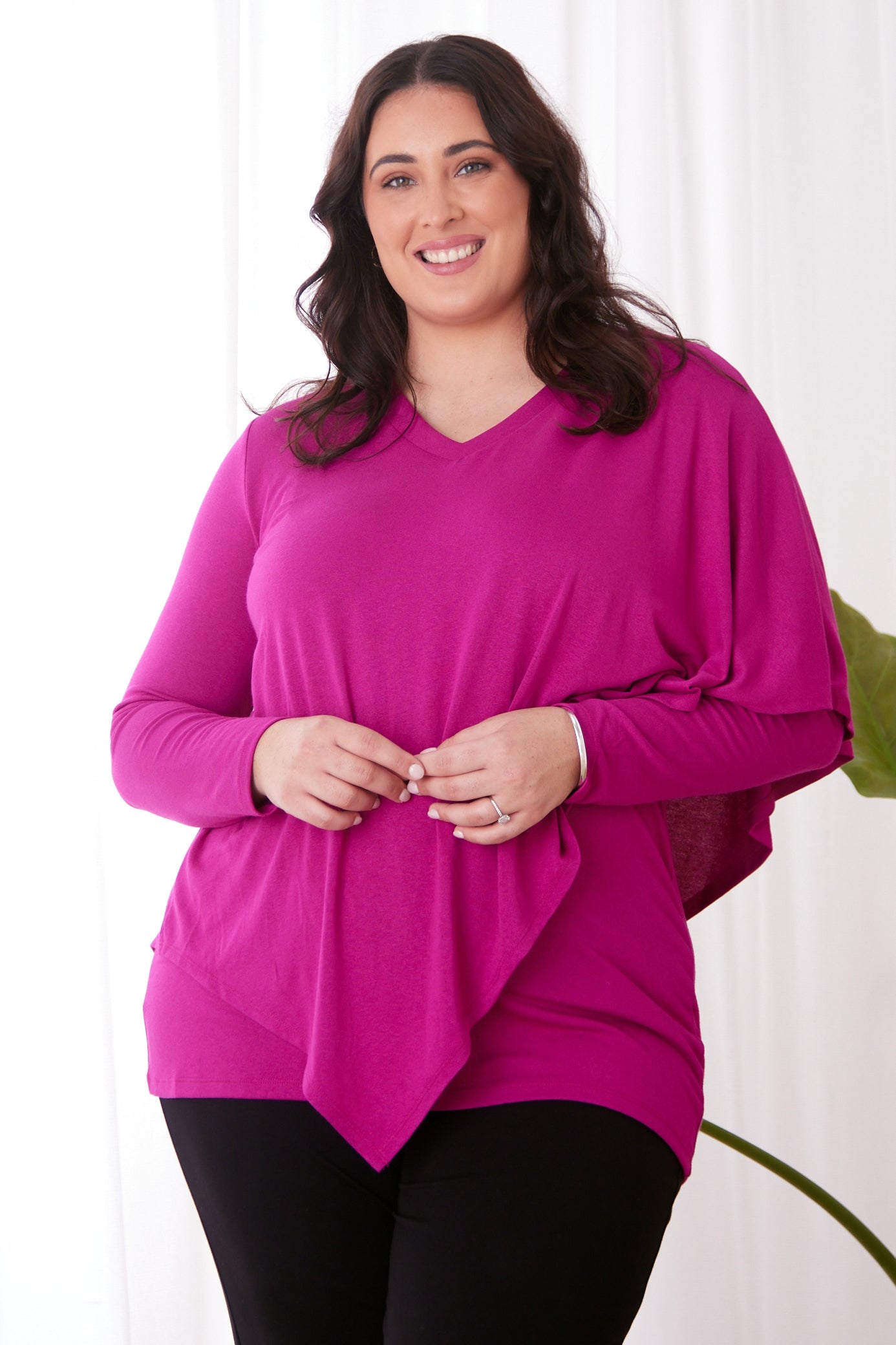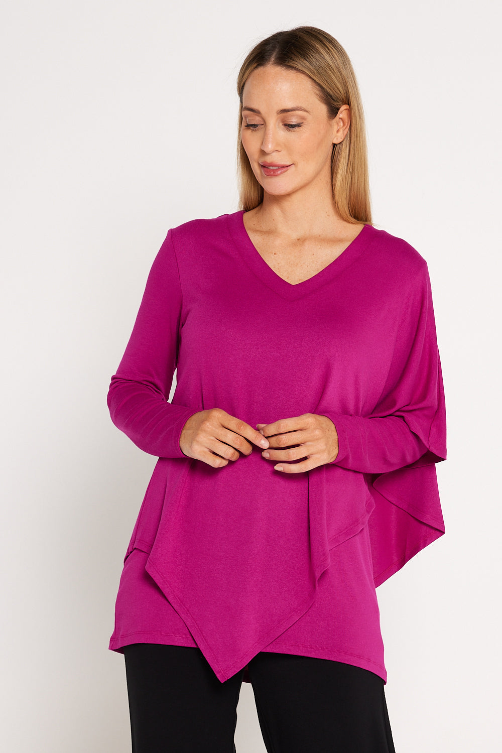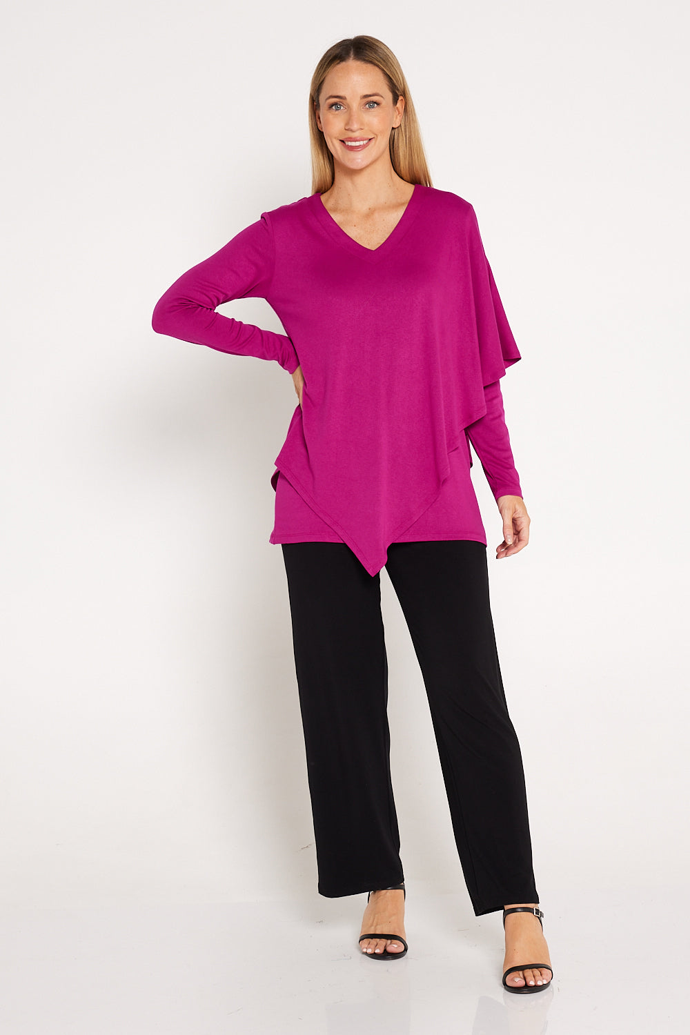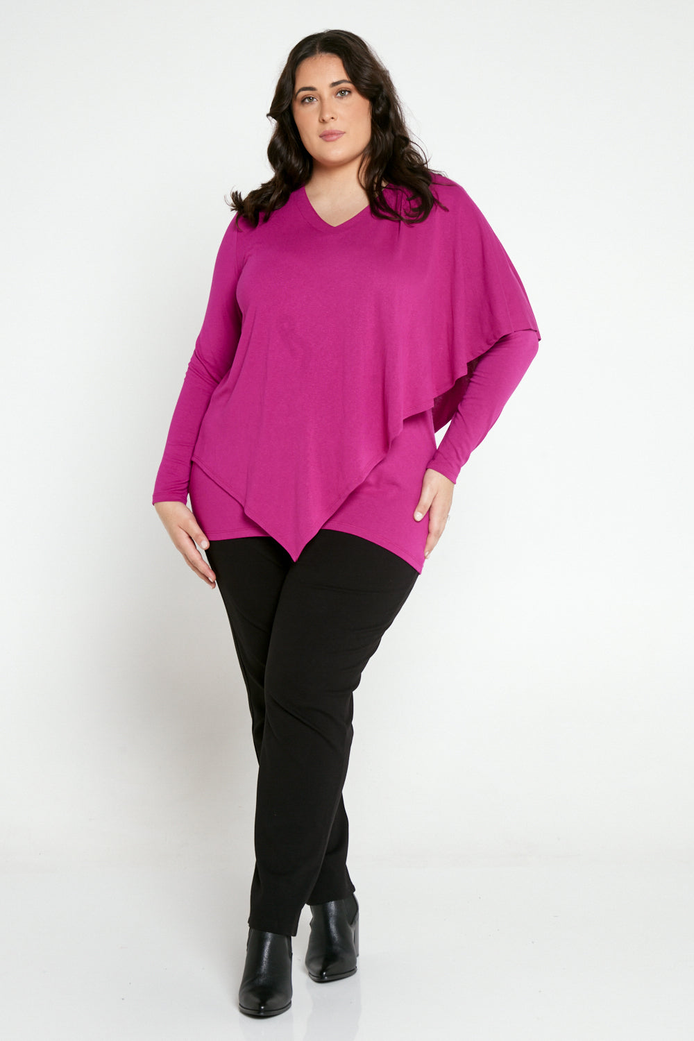 If you're a fan of the Tova Dress, then you are definitely going to love the Tahiya Top. Featuring the same style of asymmetric cape overlay, which drapes over one shoulder and down diagonally down to a point with soft folds. The stunning magenta pink is the perfect match to this statement silhouette. This is an incredible piece for those who love collecting unique, fashion forward designs.