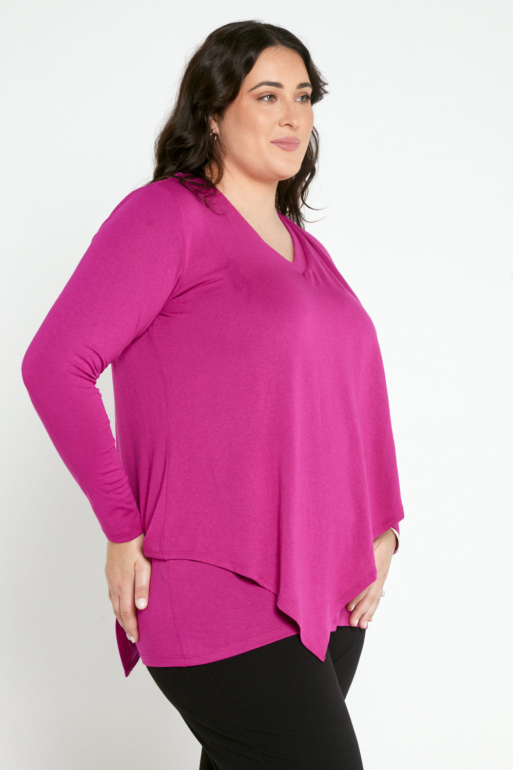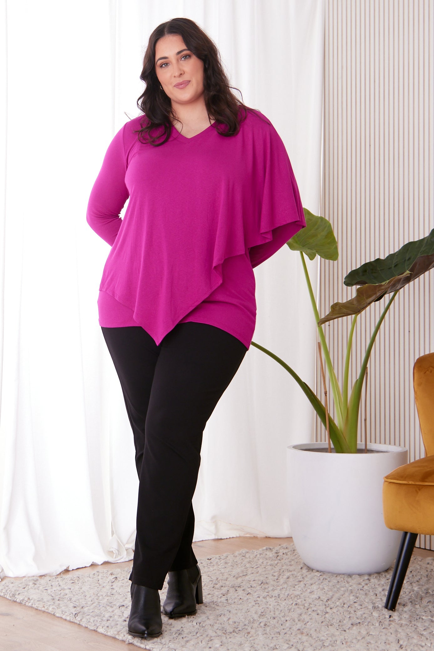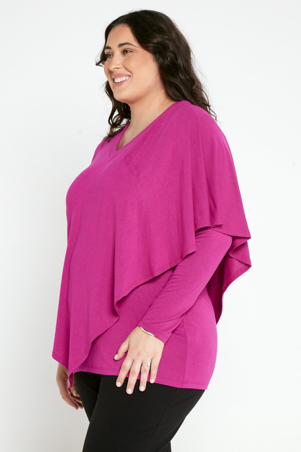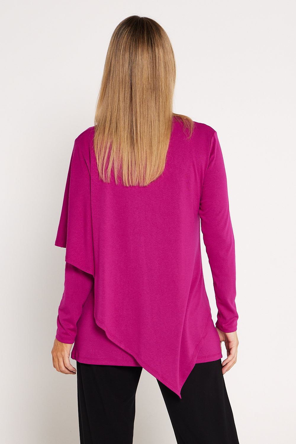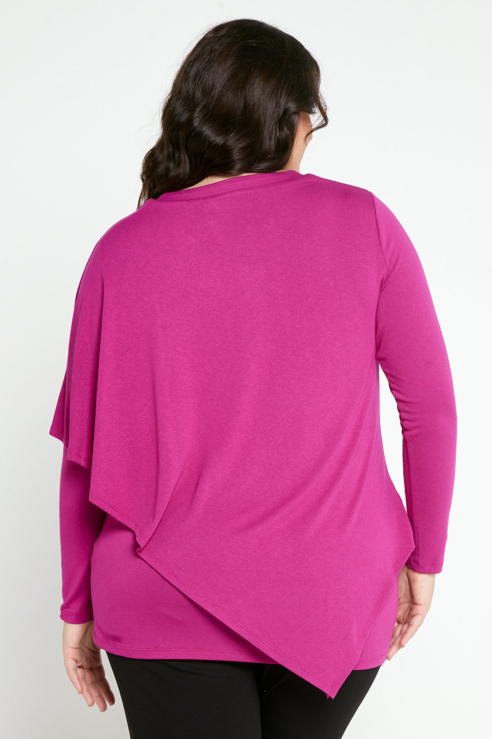 If you're a fan of the Tova Dress, then you are definitely going to love the Tahiya Top. Featuring the same style of asymmetric cape overlay, which drapes over one shoulder and down diagonally down to a point with soft folds. The stunning magenta pink is the perfect match to this statement silhouette. This is an incredible piece for those who love collecting unique, fashion forward designs.