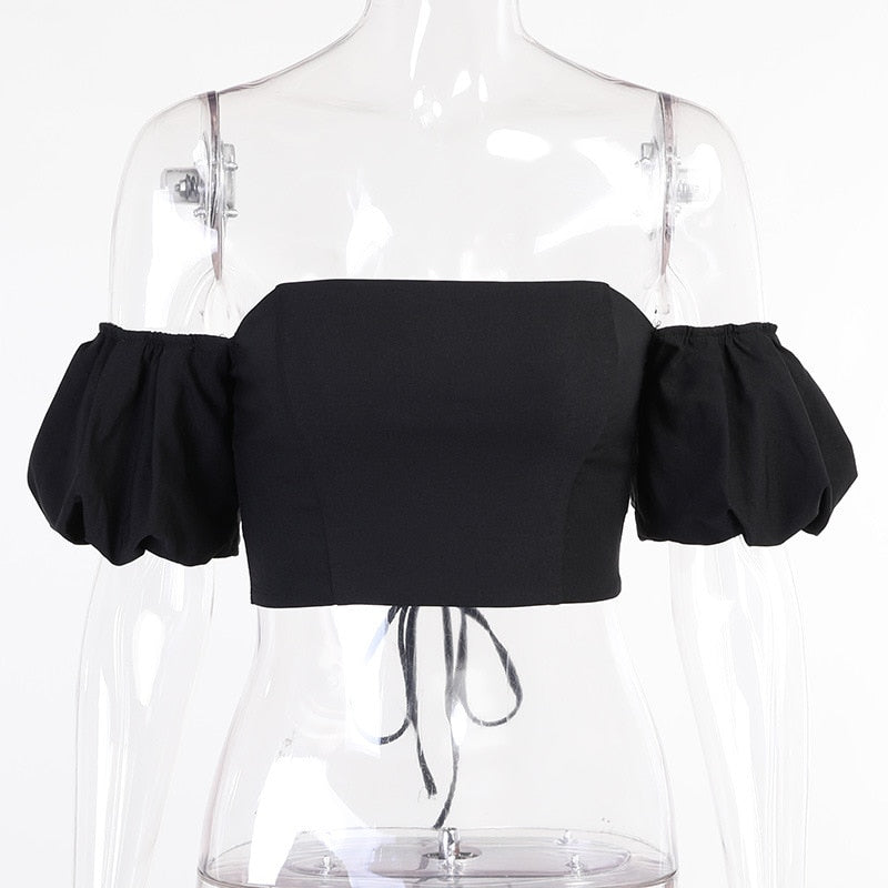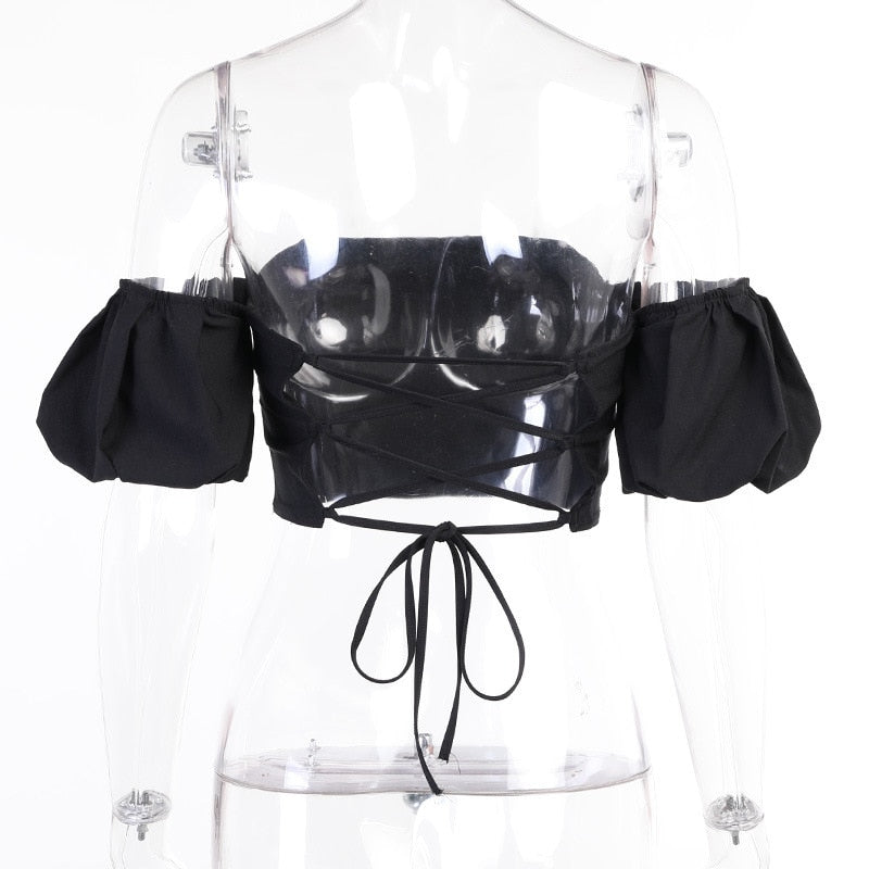 Solid Strapless Crop Top with Back Lace-Up Closure and Puff Short Sleeve